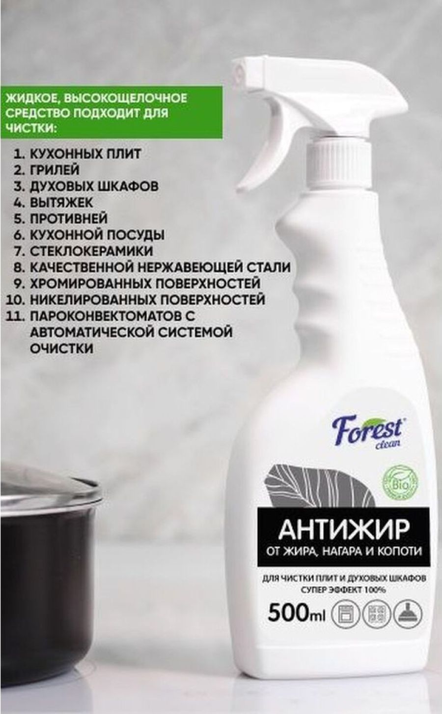FOREST CLEAN Антижир 500 мл Жидкое высокощелочное средство для удаления жира, нагара, копоти, для ручной чистки кухонных плит, грилей, духовых шкафов, вытяжек, противней, вытяжных зонтов, фритюрниц и жарочного оборудования. Антижир / антипригар / жироудалитель эффективно очищает от пригоревших и присохших жиров, масел, сахара на стеклокерамике, качественной нержавеющей стали, хромированных, никелированных и других поверхностях. Удаляет неприятные запахи, загрязнения от нефтепродуктов. Легко смывается, не оставляя плёнок, царапин, разводов, а также препятствует повторному осаждению загрязнений. Не оставляет царапин и разводов. Удобно использовать при чистке вертикальных поверхностей. При очистки грилей, плит, жарочного оборудования, вытяжек и другого оборудования необходимо распылить средство на охлажденную поверхность и через 5-15 минут разтереть и удалить грязь губкой, смыть водой и вытереть насухо. Во время применения использовать перчатки.