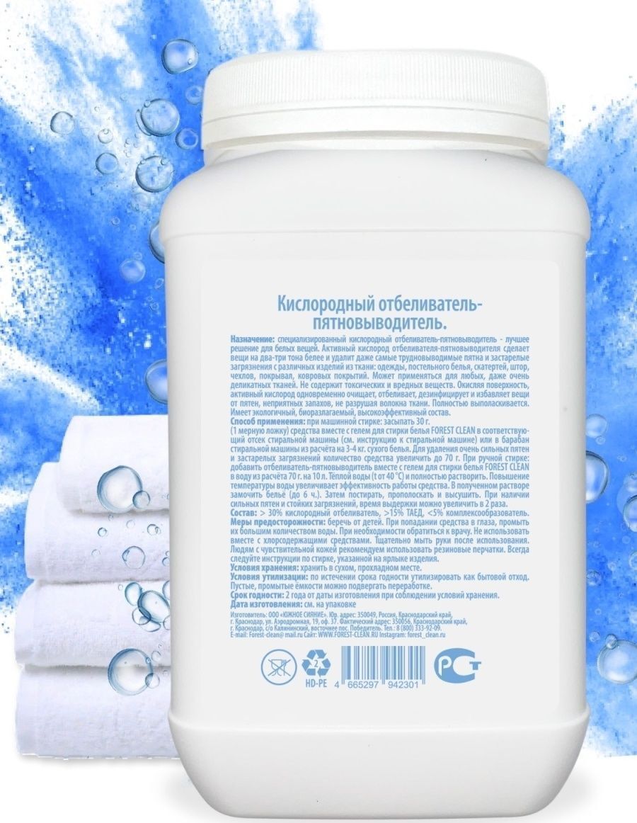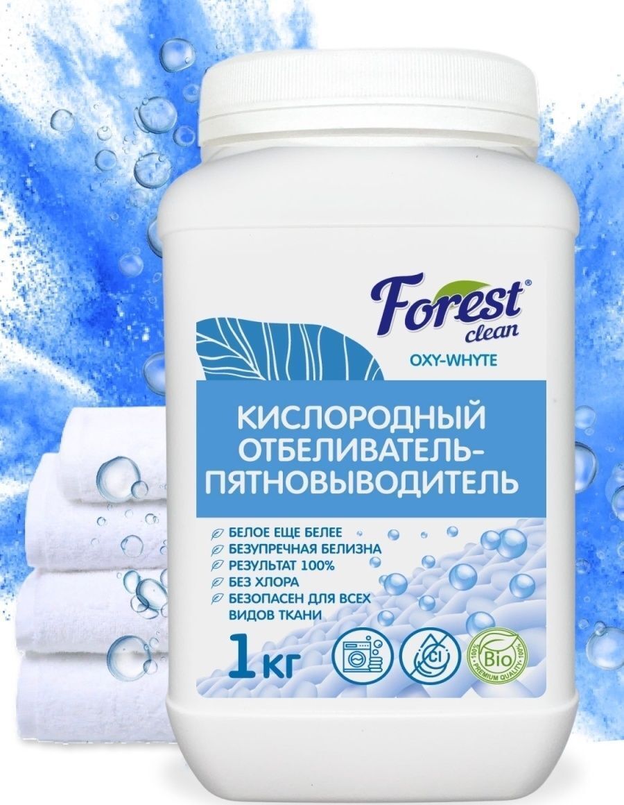 FOREST CLEAN Кислородный отбеливатель-пятновыводитель 1 кг Специализированный кислородный отбеливатель-пятновыводитель - лучшее решение для белых вещей. Активный кислород отбеливателя-пятновыводителя сделает вещи на два три тона белее и удалит даже самые трудновыводимые пятна и застарелые загрязнения с различных изделий и ткани: Одежды, постельного белья, скатертей, штор, чехлов, покрывал, ковровых покрытий. Может применяться для любых, даже очень деликатных тканей. Не содержит токсических и вредных веществ. окисляя поверхность, активный кислород одновременно очищает, отбеливает, дезинфицирует и избавляет вещи от пятен, неприятных запахов, не разрушая волокна ткани. Полностью выполаскивается. Имеет экологичный, биоразлагаемый, высокоэффективный состав.Способ применения: 1. Ручная стирка и отбеливание: На 5 л воды - Отбеливающая добавка 30 г (1 мерная ложка); 2. Автоматическая стирка и отбеливание: На 3 - 4 кг сухого белья - Отбеливающая добавка 30-70г (1-2 мерных ложек).