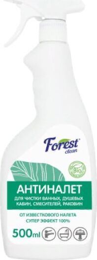 FOREST CLEAN Антиналёт 500 мл Кислотное средство для чистки ванных комнат, душевых кабин, раковин, хромированных смесителей, унитазов, писсуаров, а также кафеля, керамики, стекла, нержавеющей стали, пластмассы, акрила и других кислостойких поверхностей. Эффективно очищает от солевого и известкового налета, водного камня, ржавчины, мыла, кожного жира и других загрязнений. AROMA-эффект после применения средства. Способ применения: перед применением средства необходимо проверить поверхность на чувствительность к кислоте. Для обработки сантехники (ванной, душевых кабин, унитазов, писсуаров, раковин) и других поверхностей: средство распылить на очищаемую поверхность, оставить на 5-15 минут. Растереть губкой или щёткой и смыть водой.