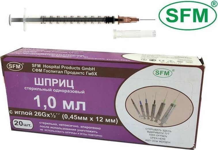Шприц туберкулиновый съемной иглой 0,45х12 мм состоит из трех компонентов: цилиндр, поршень и манжета. Имеет градуировку по шкале 1 мл (для туберкулина). Шприц поставляются с надетой иглой для удобства и стерильности. Безболезненность инъекции обуславливается легким скольжением поршня, без трения. Удерживающее кольцо на поршне предотвращает потерю медикамента, а точная градуировка на шприце позволяет легко считывать показания