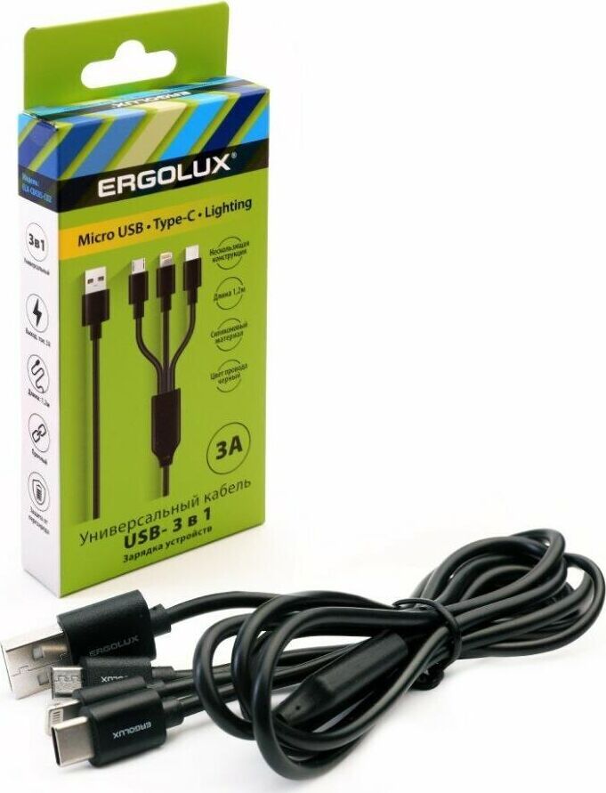 • Тип провода: 3 в 1 (Lightning+Type C+Micro USB) • Сила тока: 3А • Кабель для зарядки • Длина кабеля: 120 см • Материал: PVC оплётка + силикон • Цвет: Черный • Упаковка: Коробка