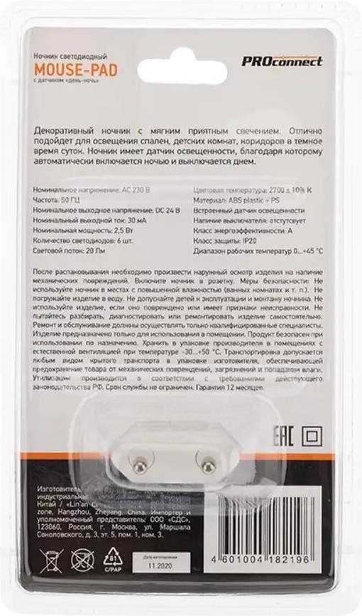 Светодиодный ночник с датчиком «день-ночь» , для освещения бытовых помещений, коридоров, спален и санузлов в темное время суток. Благодаря мягкому белому свечению создает уют и комфорт в помещении. Выполнен из качественного белого пластика. Светодиодное освещение служит гораздо дольше обычных ламп и значительно сокращает энергопотребление. Датчик освещённости автоматически отключает светильник в светлое время суток и включает при недостаточной освещенности, что позволяет экономить электричество. Питание от сети AC 230 В/50 Гц. Размер изделия: 11,8х5,8х5,5 см.