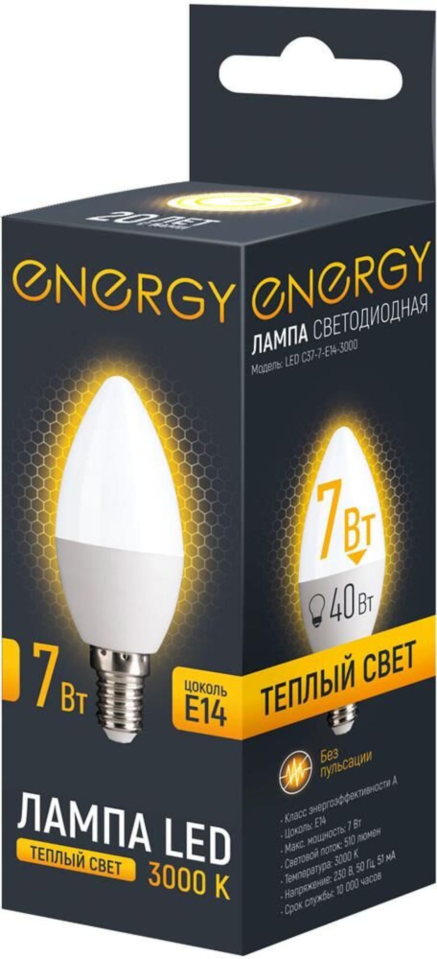 Лампа светодиодная Energy LED С37-7-E14-3000 Цоколь E14 Световой поток 510 люмен Срок службы 10 000 часов Цветовая температура 3000 К (теплый свет) Класс энергоэффективности А Без пульсации Напряжение 230 В, 50 Гц Диаметр 3,8 см Высота 10 см Мощность аналога лампы накаливания 40 Вт Мощность 7 Вт