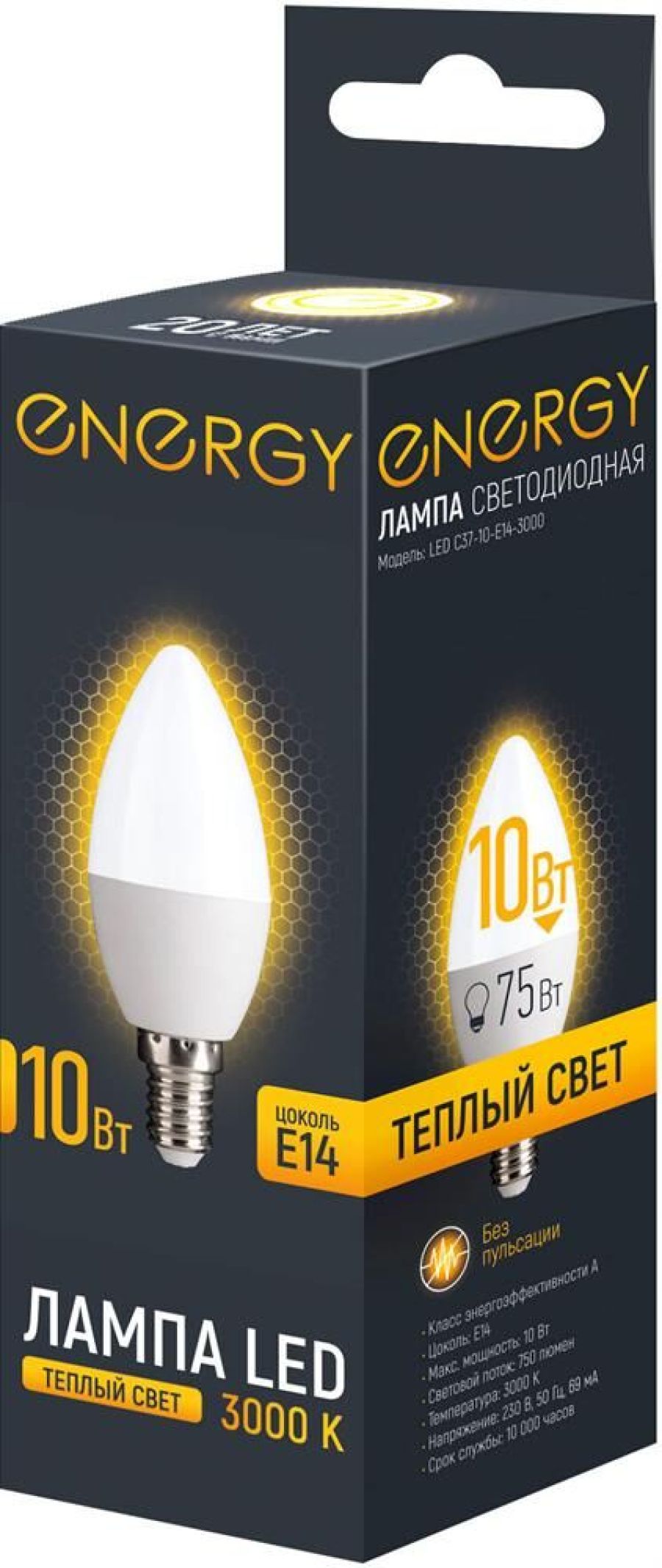 Лампа светодиодная Energy LED С37-10-E14-3000 Цоколь E14 Световой поток 750 люмен Срок службы 10 000 часов Цветовая температура 3000 К (теплый свет) Класс энергоэффективности А Без пульсации Напряжение 230 В, 50 Гц Диаметр 3,8 см Высота 11,2 см Мощность аналога лампы накаливания 75 Вт Мощность 10 Вт