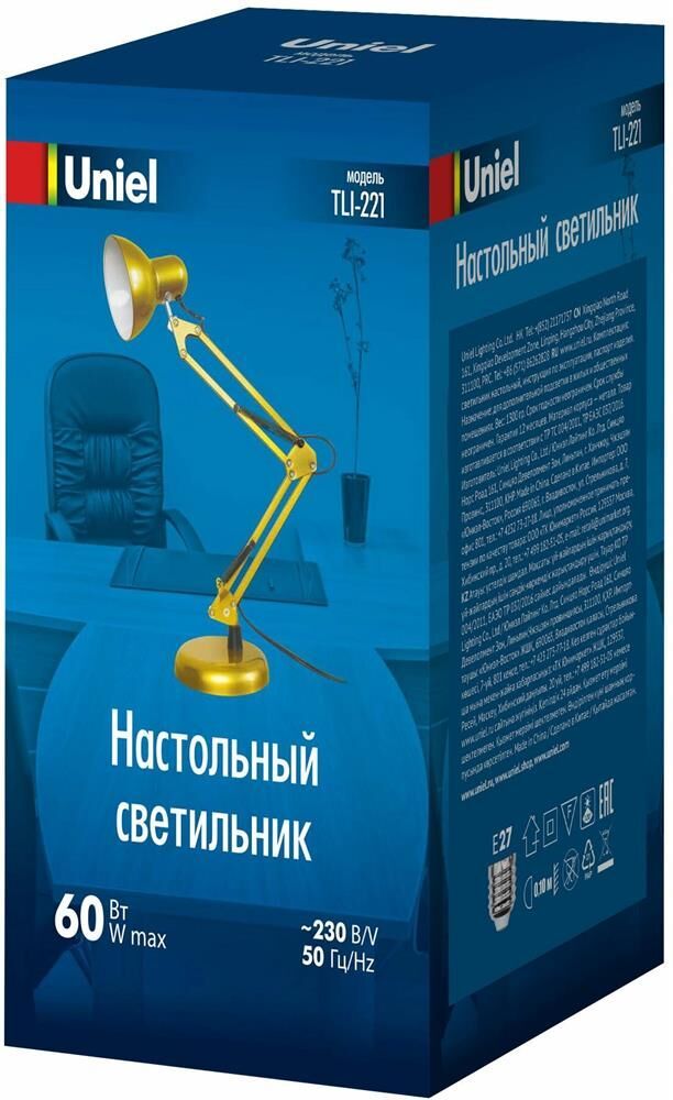 Артикул UL-00011103 E (новинка) Да Цоколь E27 Мощность, Вт 60 Высота изделия, мм 400 Длина изделия, мм 200 Ширина изделия, мм 155 Вес брутто, кг 1,41 Материал корпуса (изделия) металл Цвет корпуса (изделия) золотой Тип выключателя механический Срок гарантии, мес. 12 месяцев Срок годности не ограничен Срок службы, ч 50000 Страна производства Китай