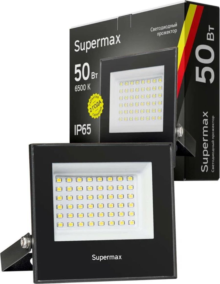 Светодиодный прожектор SUPERMAX обладает регулируемой лирой-креплением, которая позволяет поворачивать прожектор на 180 градусов, а так же степенью защиты от пыли и влаги по стандарту IP65 - поэтому прожектор подходит для установки как в закрытом помещении, так и на улице. Мощность прожектора 50Вт, что является аналогом галогенового на 300 Вт, великолепная и практичная замена классическому прожектору. Служат до 40 000 часов, оттенок света – дневной белый 6500К, световой поток 5000Лм. 2 года гарантии.