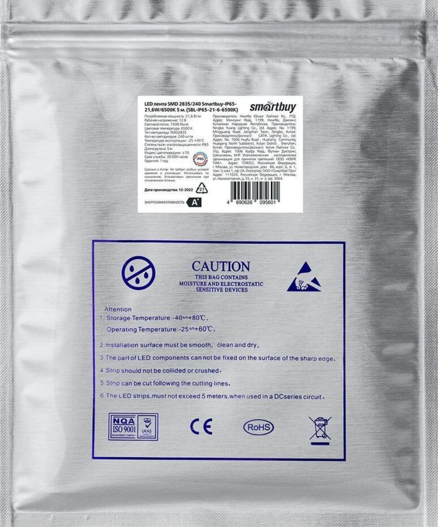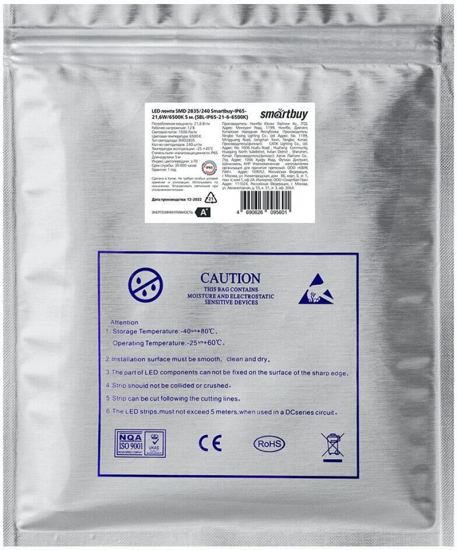 Кол-во диодов: 240 SMD(2835)/м, 6500К Мощность: 21,6 Вт/1 м, Напряжение: 12 В Катушка 5 м, Пылевлагозащита IP65, Двухслойная, 1300 лм/м