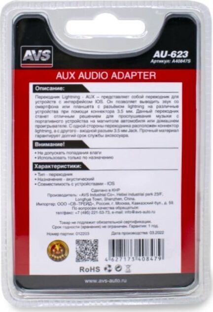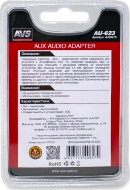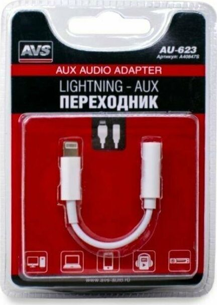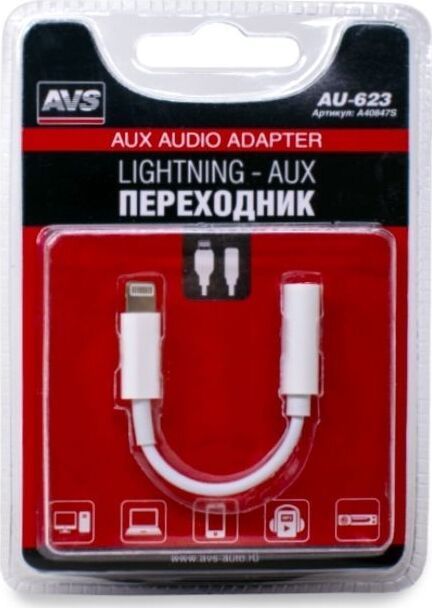 Переходник Lightning — AUX AVS AU-623- представляет собой переходник для устройств с интерфейсом IOS. Он позволяет выводить звук со смартфона или планшета с разъёмом lightning на различные устройства при помощи коннектора 3.5мм. Данный переходник станет отличным решением для прослушивания музыки с портативного устройства на магнитоле автомобиля или домашнем проигрывателе. С одной стороны переходник расположен коннектор lightning, а с другого — входной разъем 3.5мм. Jack. Прочная материал гарантирует долгий срок службы аксессуара.