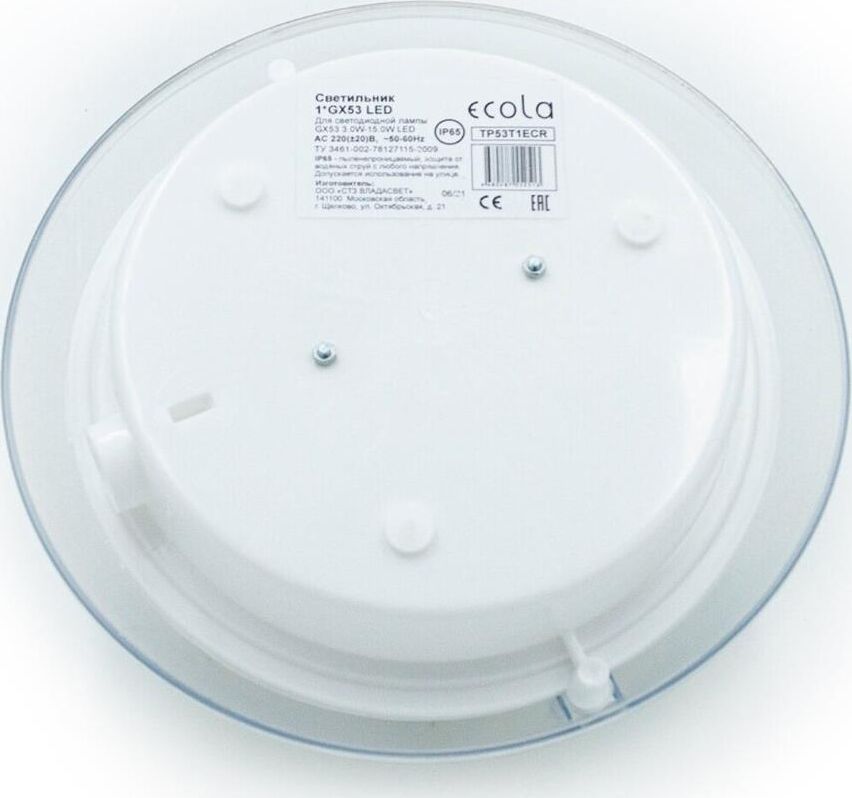 Влагозащищенный накладной светильник "Сириус" круг под одну лампу Ecola Light GX53 LED ДПП 03-60-01. Цоколь: GX53 Цвет: белый Стекло: прозрачное Форма: Круг Степень влагозащищенности: IP65 Лампа в комплект не входит Размеры: 220х220х100