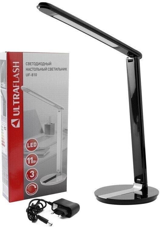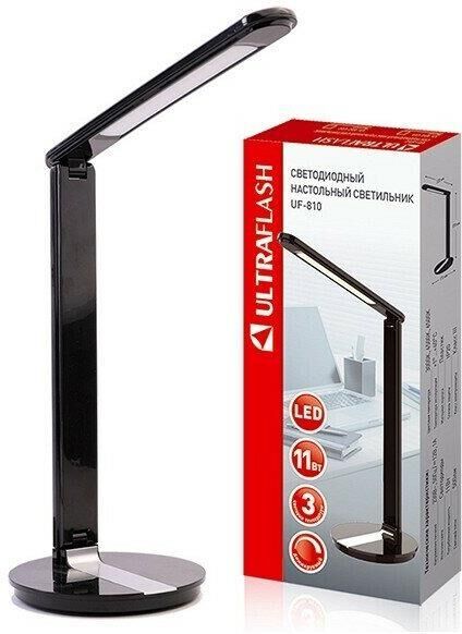 Светильник светодиодный настольный Ultraflash UF-810 предназначен для освещения индивидуального рабочего пространства. Основные характеристики: Цвет черный, источник света - встроенные светодиоды, мощность 11Вт, световой поток 500Лм, три цветовые температуры 3000К, 4500К, 6500К, диммируемый, питание от сети, материал пластик. Складной механизм обеспечивает компактное хранение и транспортировку. Гарантия 12 месяцев.
