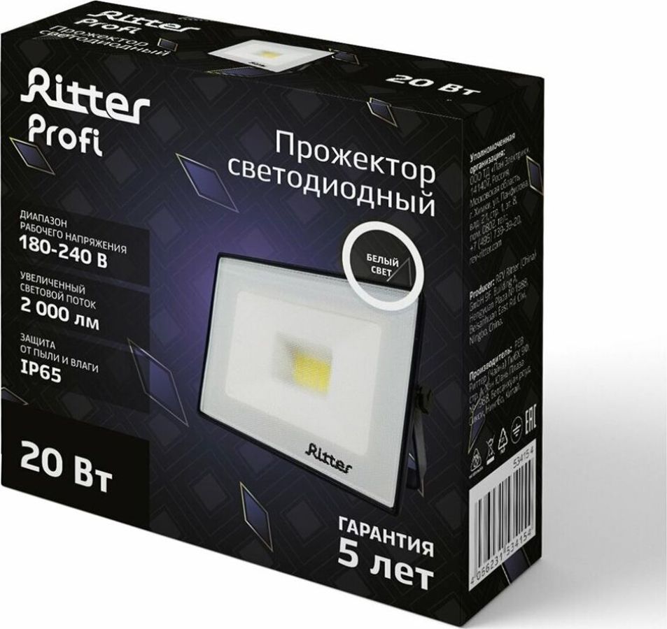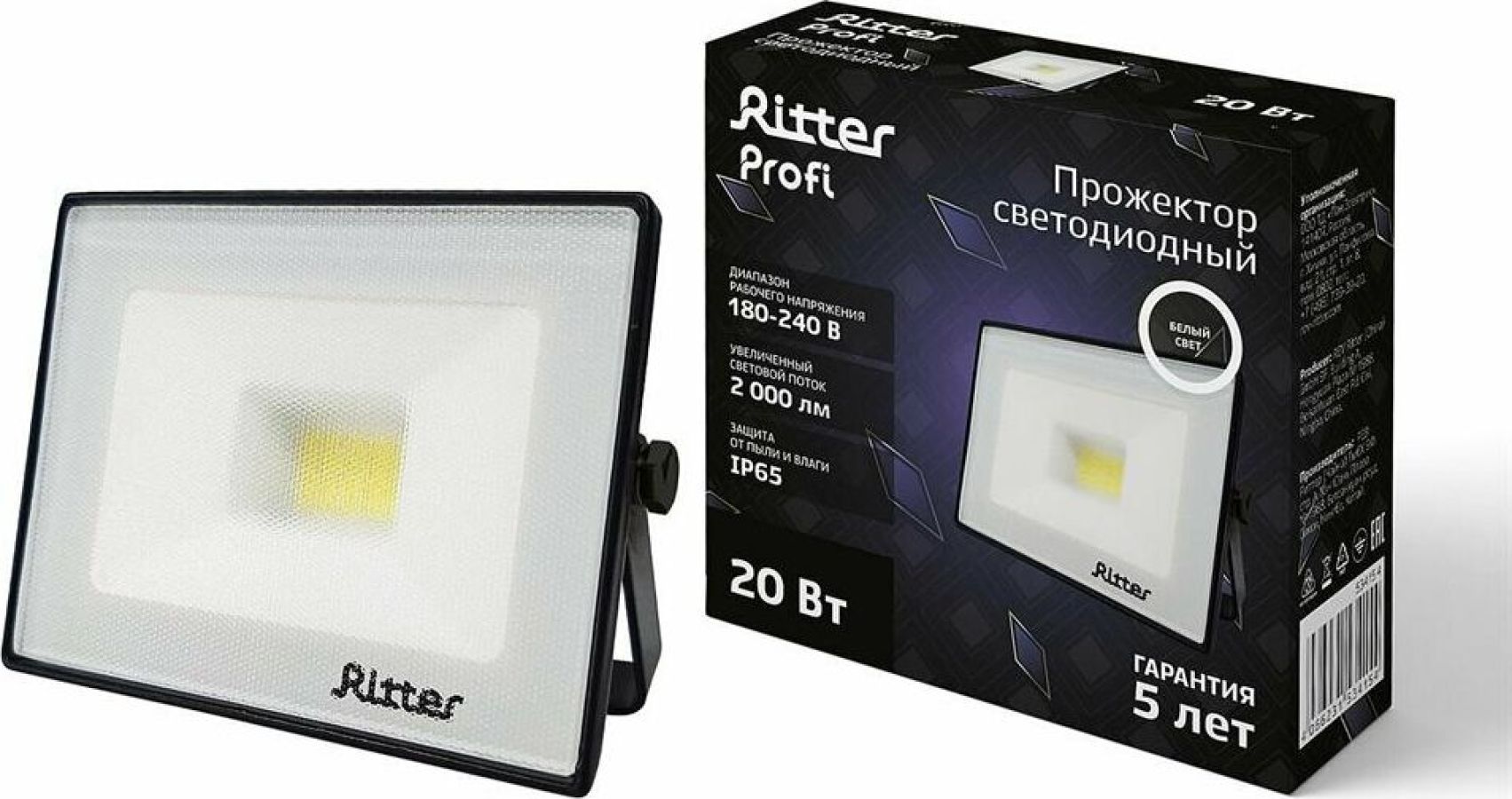 20 Вт, 4000К, 2000Лм, IP65, черный, гарантия 5 лет