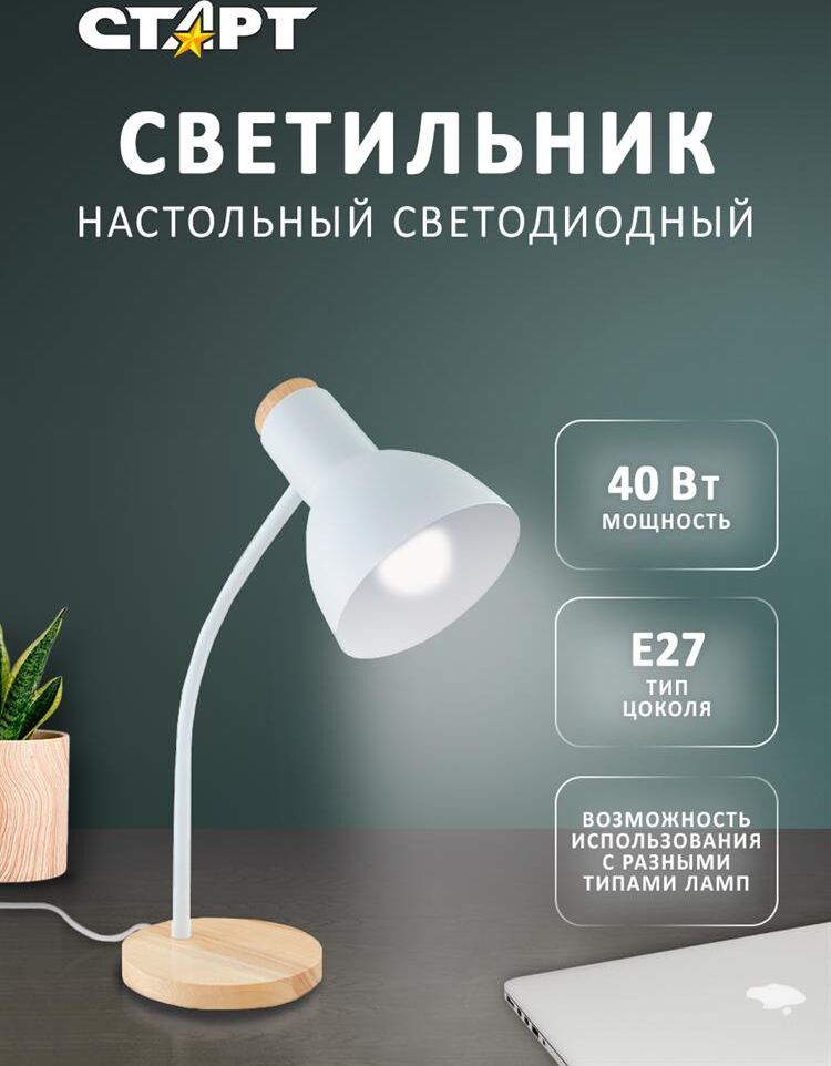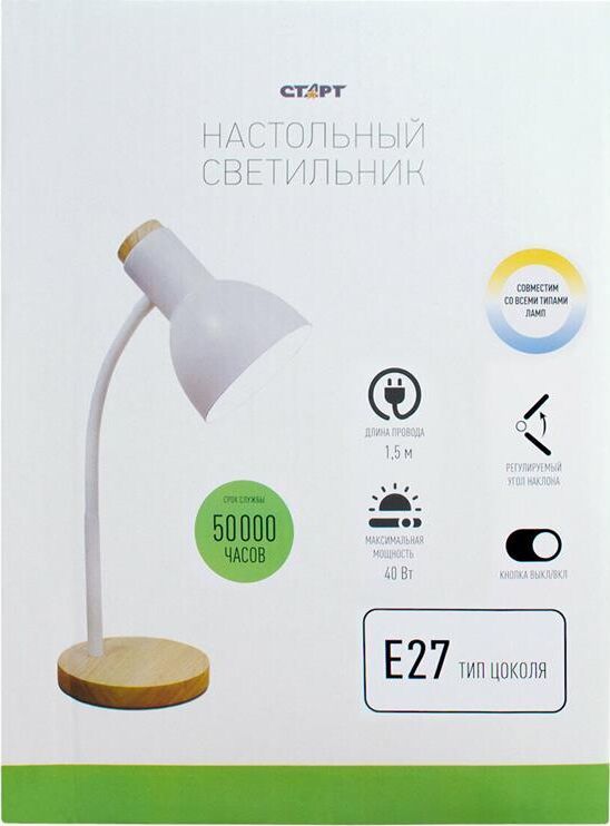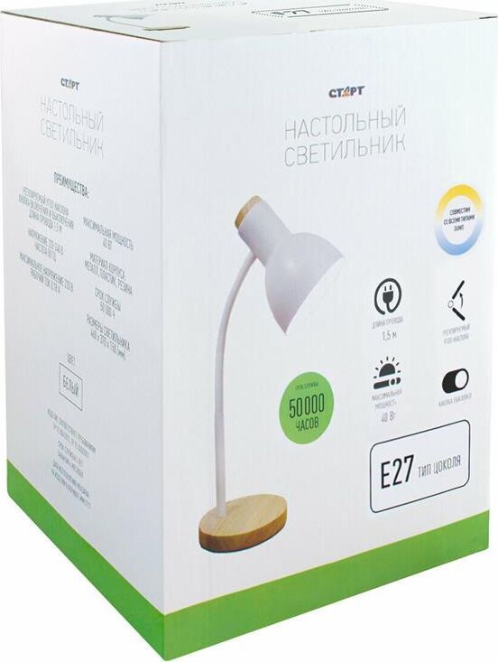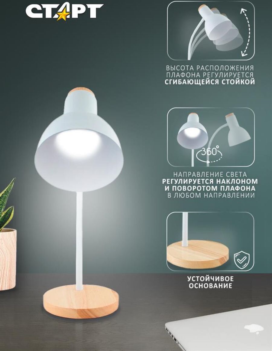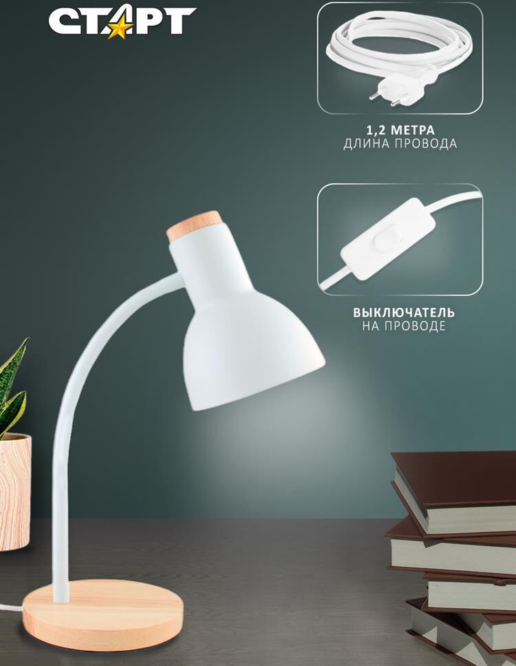 Максимальная мощность: 40 Вт Тип цоколя: E27 Возможность использования с разными типами ламп Длинна провода 1,2 м. Выключатель на проводе Материал: пластик/метал/дерево Размер: 450x170x150 мм Высота расположения плафона регулируется сгибающейся стойкой.