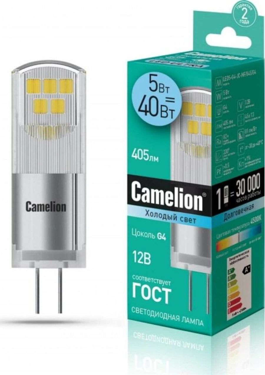 СДЛ Camelion - это инновационное решение, разработанное на основе новейших светодиодных технологий (LED). Предназначена для освещения жилых, офисных и коммерческих помещений. Встроенный источник питания позволяет использовать СДЛ Camelion в стандартных патронах. LED лампа, мощность, Вт - 5, напряжение, В - 12, световой поток, лм - 415, форма колбы - капсула, цвет колбы - прозрачный, цоколь G4, цветовая температура, К - 4500, угол светового пучка - 330, индекс цветопередачи 80+, срок службы, ч. - 30000, Без пульсации. Рифленый рассеиватель обеспечивает мягкое рассеяное свечение "без точек"