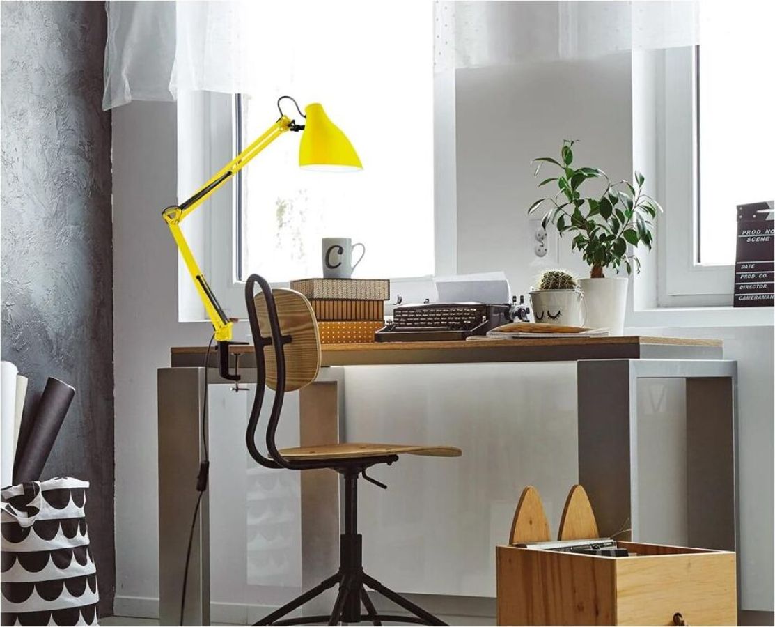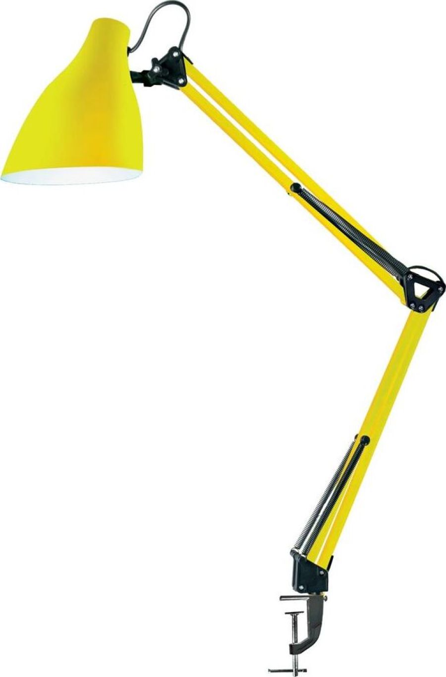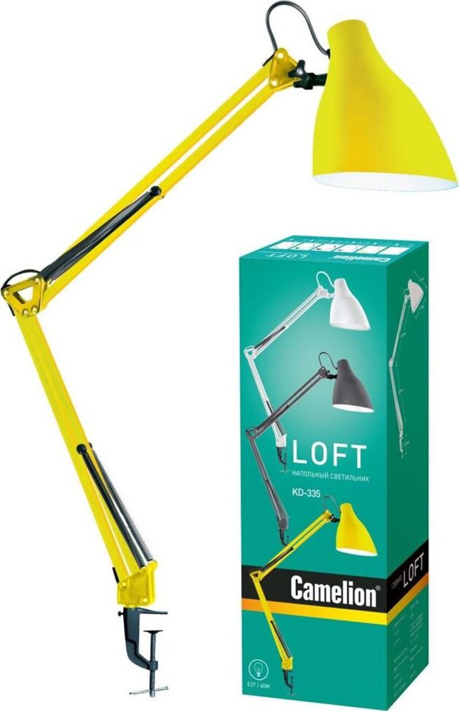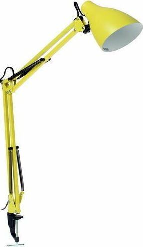 "Светильник KD-335 C07 желтый универсальная модель настольного светильника на металлической струбцине, предназначенная для освещения рабочего места, места чтения, уч бы. Может использоваться в офисных и домашних интерьерах, оформленных в разных стилях. Стойка, состоящая из двух 40-сантиметровых звеньев, и плафон неоычной формы изготовлены из металла. Матовое, не глянцевое окрашивание корпуса прида т светильнику дополнительный шарм и современный стиль. Светильник можно использовать с любыми типами ламп, в том числе со светодиодными. Устойчивая металлическая струбцина надежно прикрепляет светильник к любой горизонтальной поверхности толщиной до 5 см. Плафон над жно фиксируется в нужном положении винтовыми зажимами. Регулировка высоты и угла поворота плафона возможна в широком диапазоне. С выключателем на проводе. Стиль - LOFT. Будет гармонично смотреться в классическом интерьере и в современных интерьерах стилей лофт, техно и скандинавский."