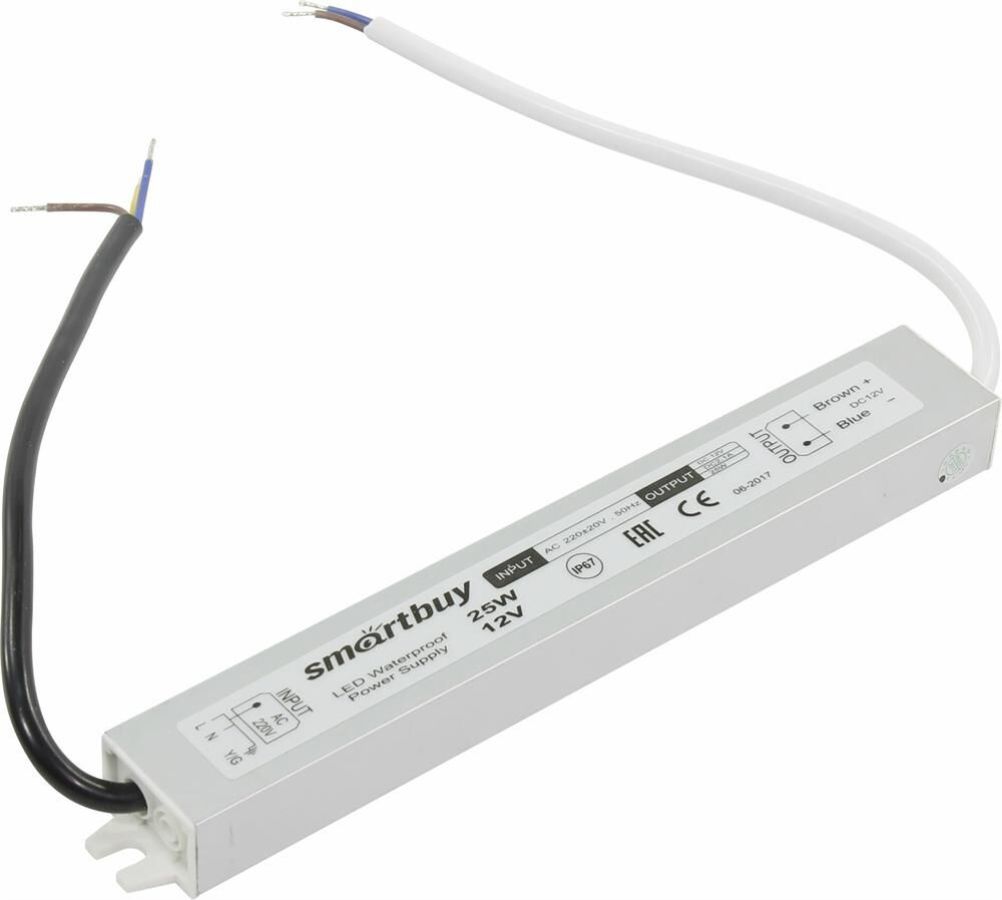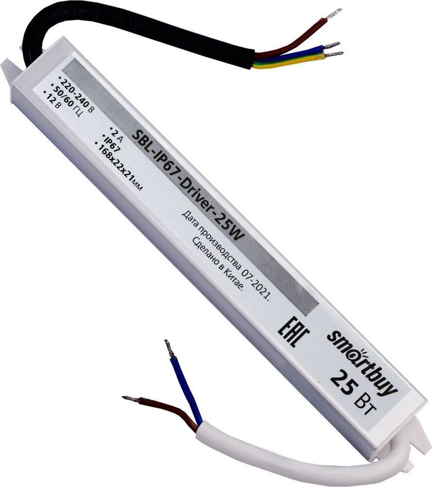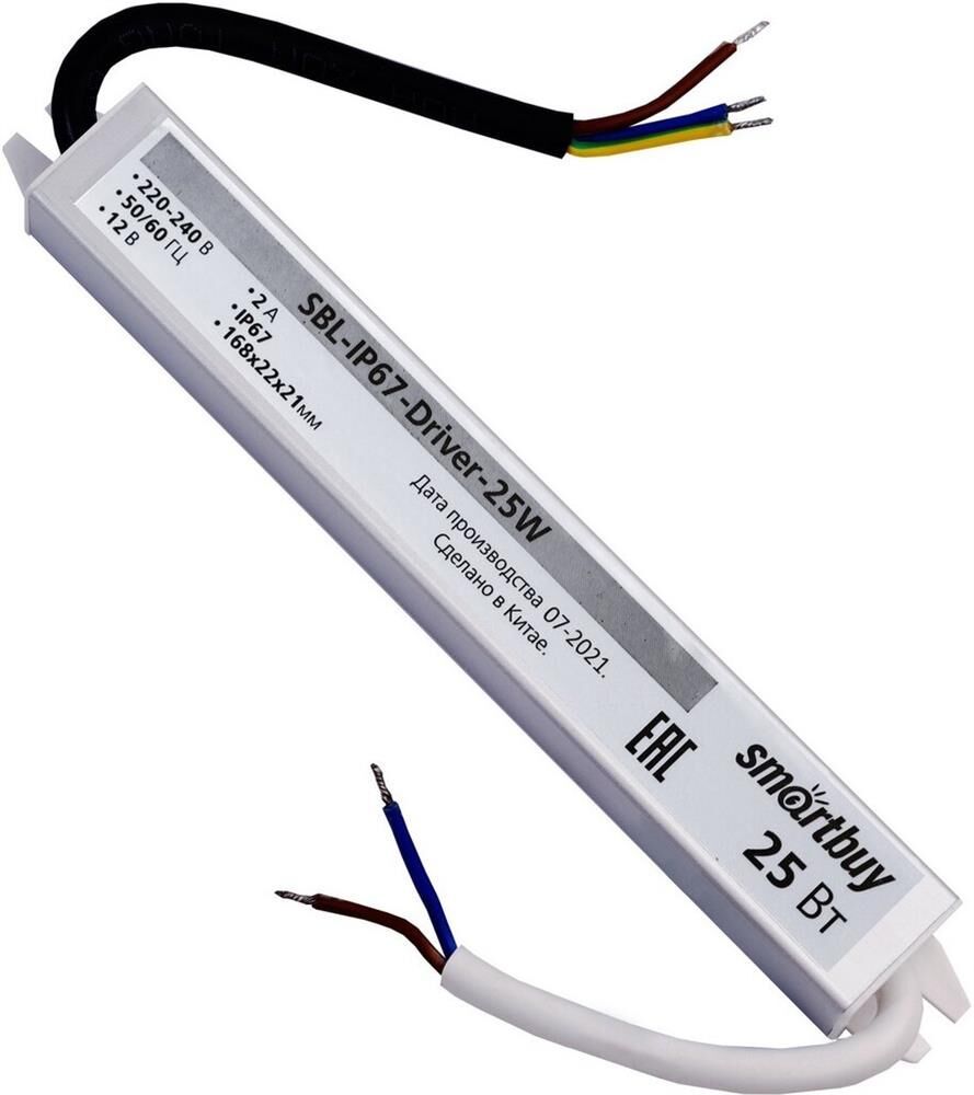 Мощность: 25 Вт, Входное напряжение: 220-240 В Выходное напряжение: 12 В, Сила тока: 2,08 А Размеры: 222х30х20 мм, IP67