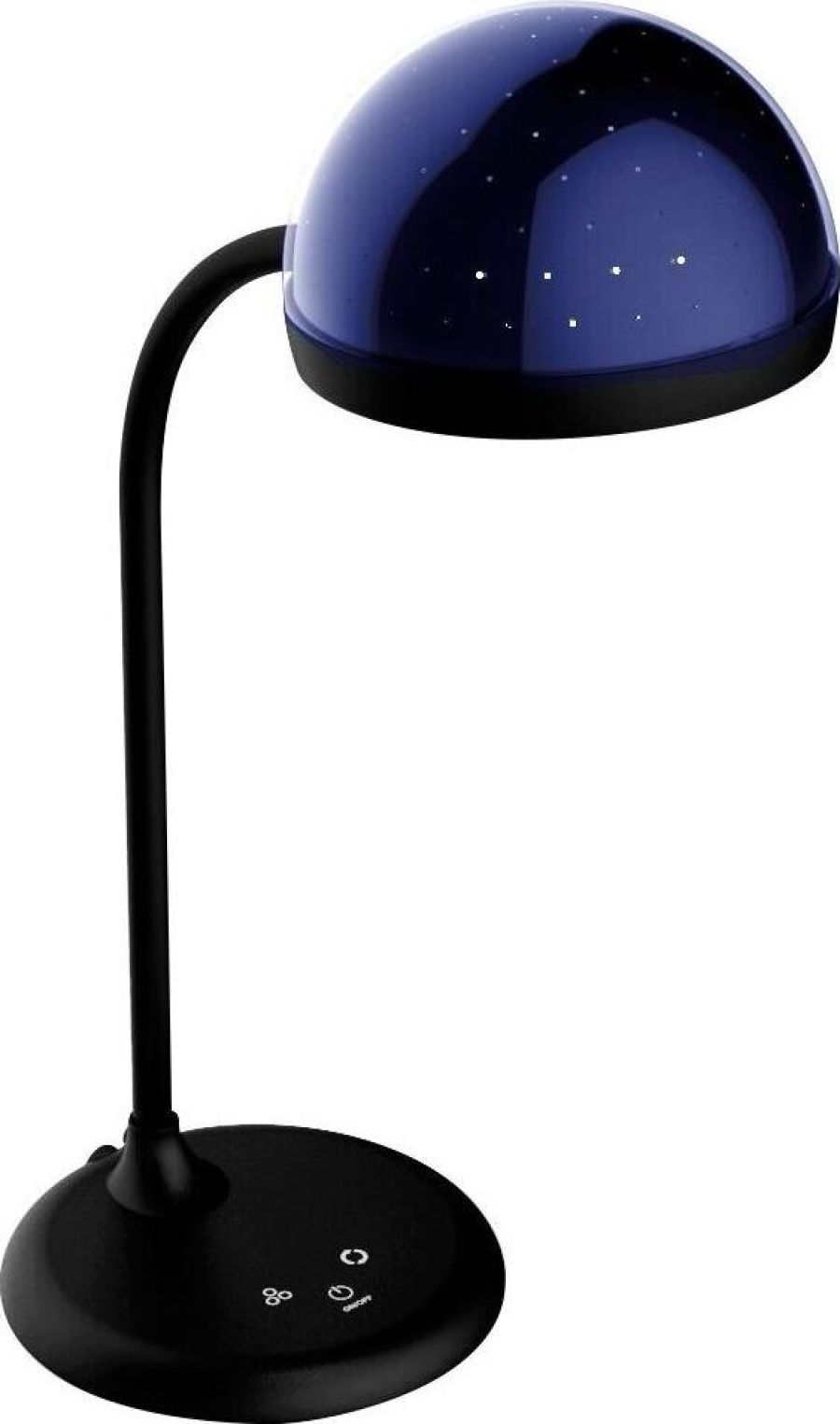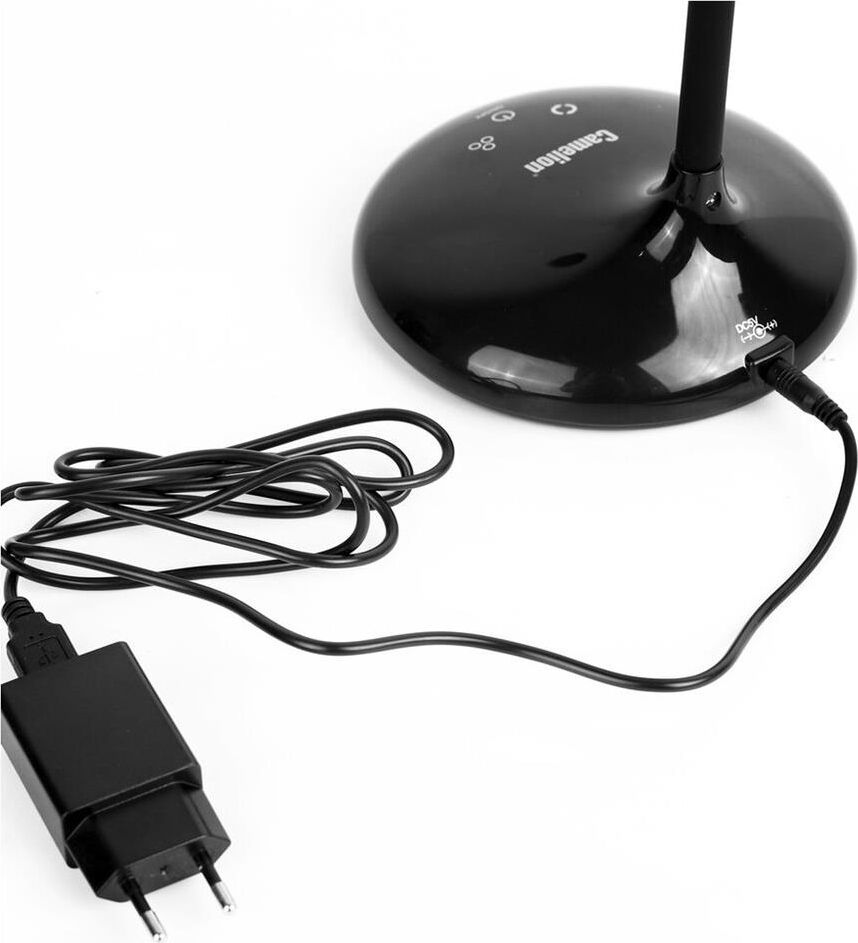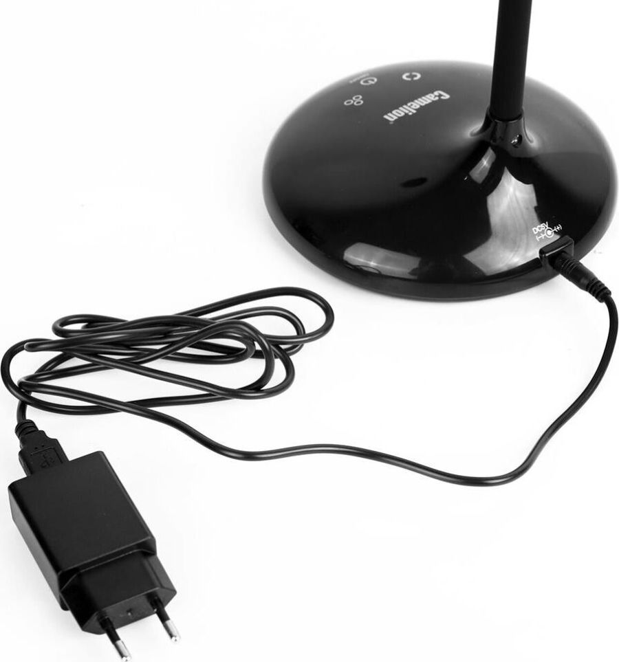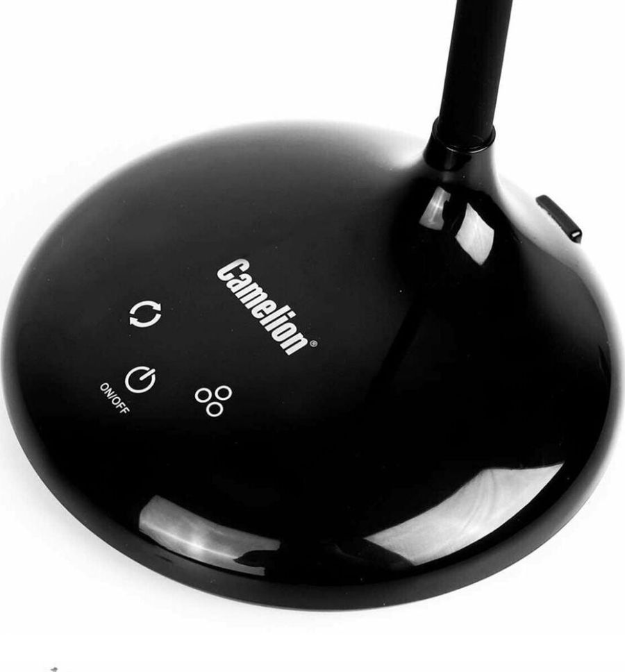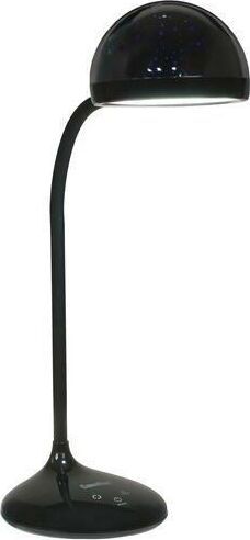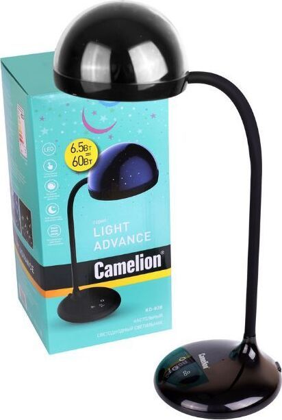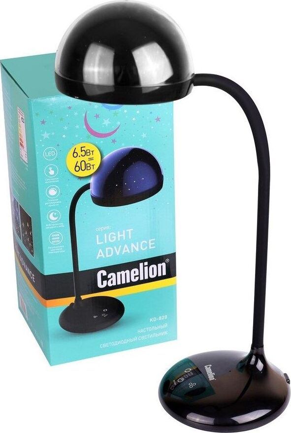 "Настольный светодиодный светильник Camelion KD-828 сочетает в себе функцию местного освещения рабочих мест в офисах, в домашних интерьерах , в комнатах детей и подростков и функцию RGB-проектора звездного неба. Источник света - встроенные светодиоды, мощность 6,5 Вт, макс. световой поток - 360лм, основание и плафон изготовлены из ABS-пластика, гибкая металлическая стойка в силиконовом кожухе позволяет регулировать угол наклона плафона кольцевой формы. Светильник имеет верхнюю часть плафона в виде темной полусферы, которая нужна для создания проекций звезд. При включении режима «Звездное небо» вы сможете получить маленький планетарий на стенах и потолке комнаты ,причем цвет звездного неба сможете выбрать самостоятельно. Подсветка звездного неба светодиодная, поэтому для получения проекции звезд и луны в комнате должно быть темно. Этот проектор звезд понравится всем членам семьи. Для маленьких детей – это интересный ночник для спокойного сна, для детей постарше и взрослых– красивая подсветка дл