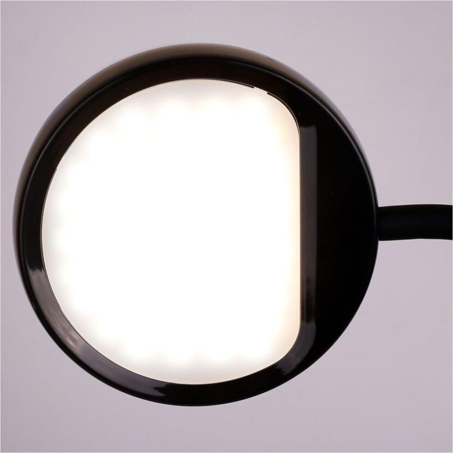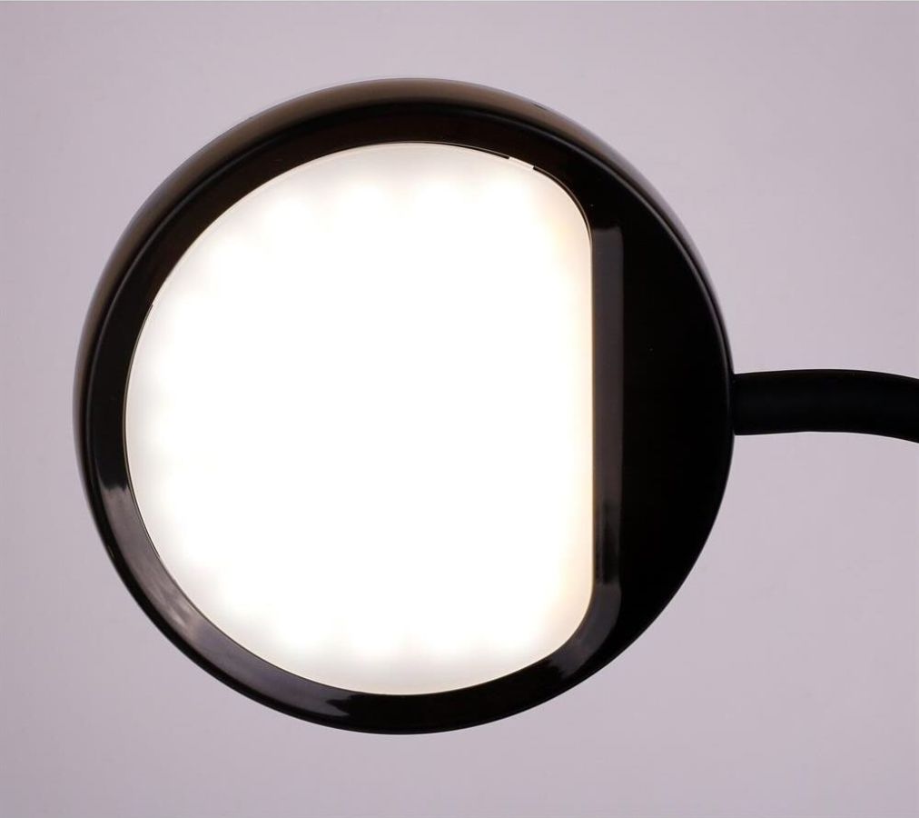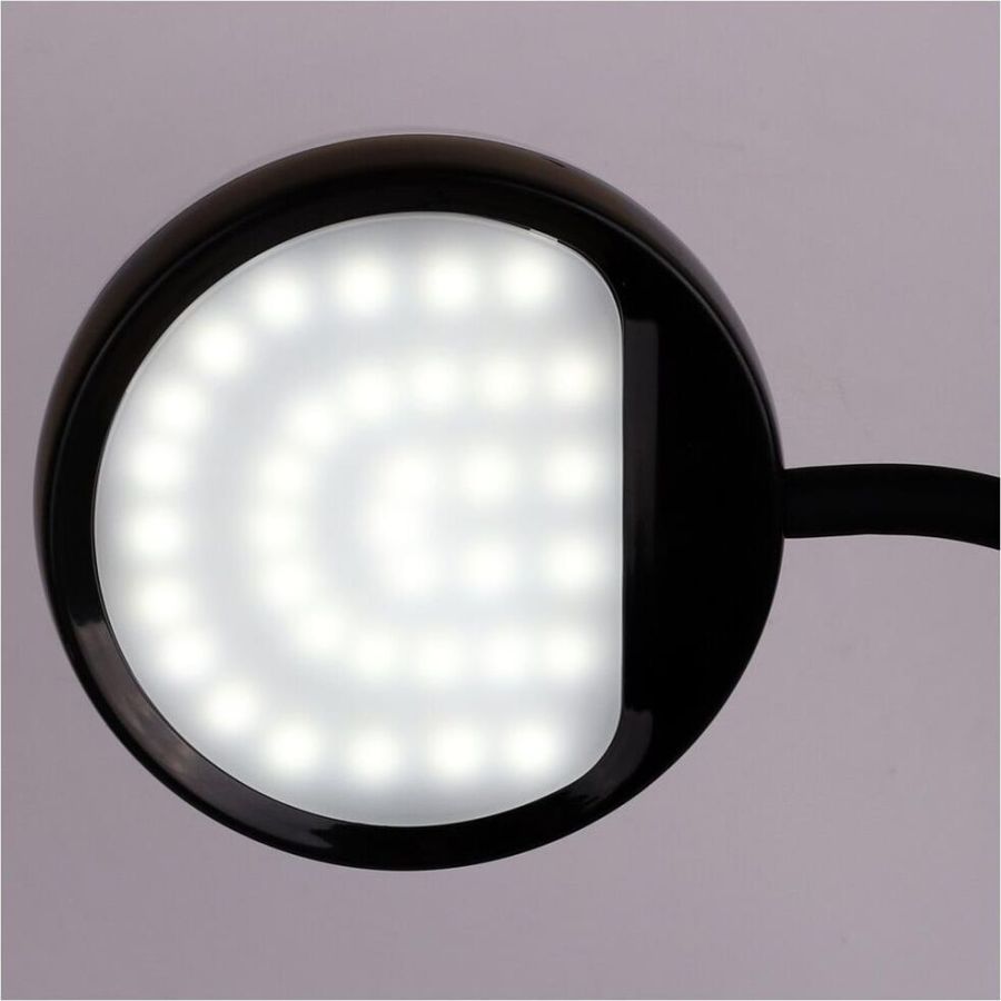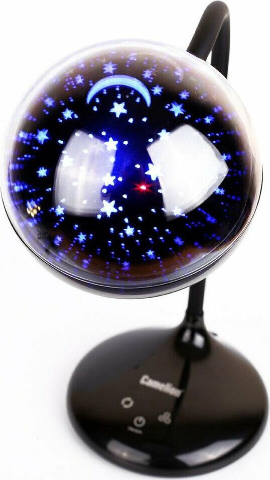 "Настольный светодиодный светильник Camelion KD-828 сочетает в себе функцию местного освещения рабочих мест в офисах, в домашних интерьерах , в комнатах детей и подростков и функцию RGB-проектора звездного неба. Источник света - встроенные светодиоды, мощность 6,5 Вт, макс. световой поток - 360лм, основание и плафон изготовлены из ABS-пластика, гибкая металлическая стойка в силиконовом кожухе позволяет регулировать угол наклона плафона кольцевой формы. Светильник имеет верхнюю часть плафона в виде темной полусферы, которая нужна для создания проекций звезд. При включении режима «Звездное небо» вы сможете получить маленький планетарий на стенах и потолке комнаты ,причем цвет звездного неба сможете выбрать самостоятельно. Подсветка звездного неба светодиодная, поэтому для получения проекции звезд и луны в комнате должно быть темно. Этот проектор звезд понравится всем членам семьи. Для маленьких детей – это интересный ночник для спокойного сна, для детей постарше и взрослых– красивая подсветка дл