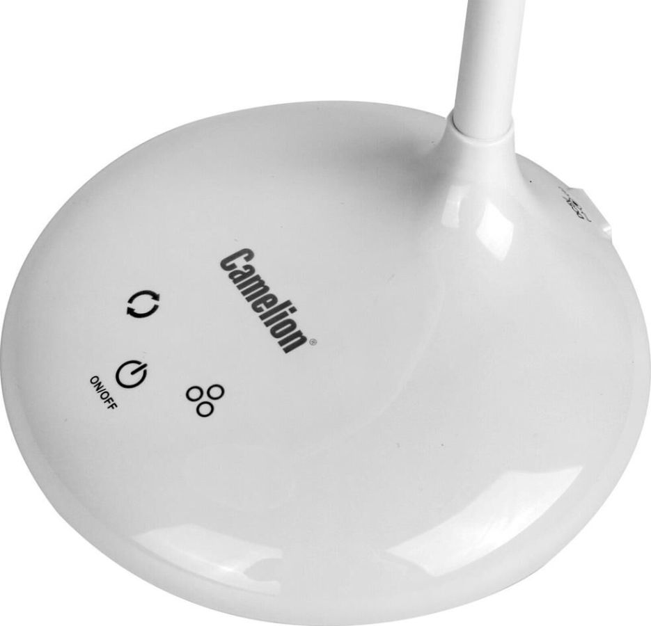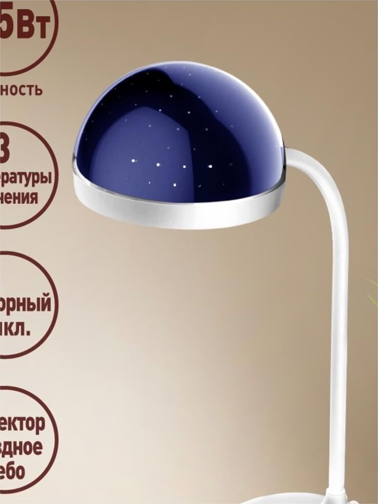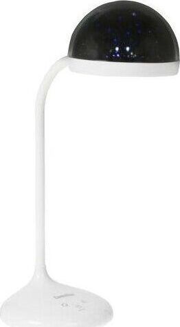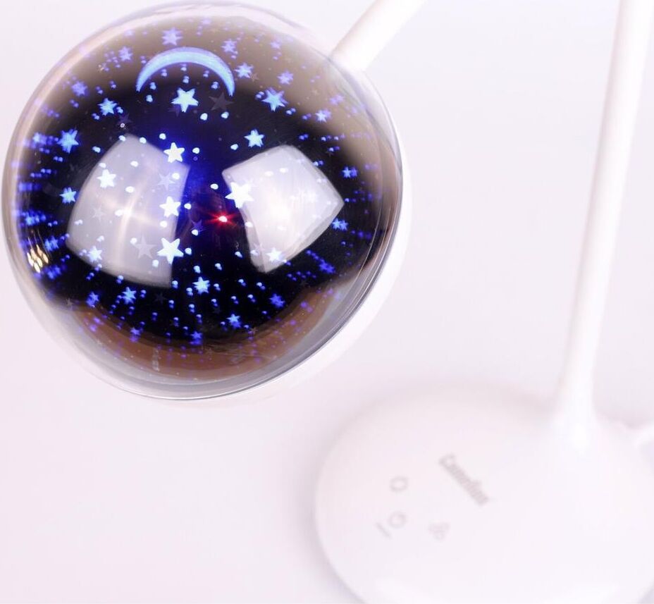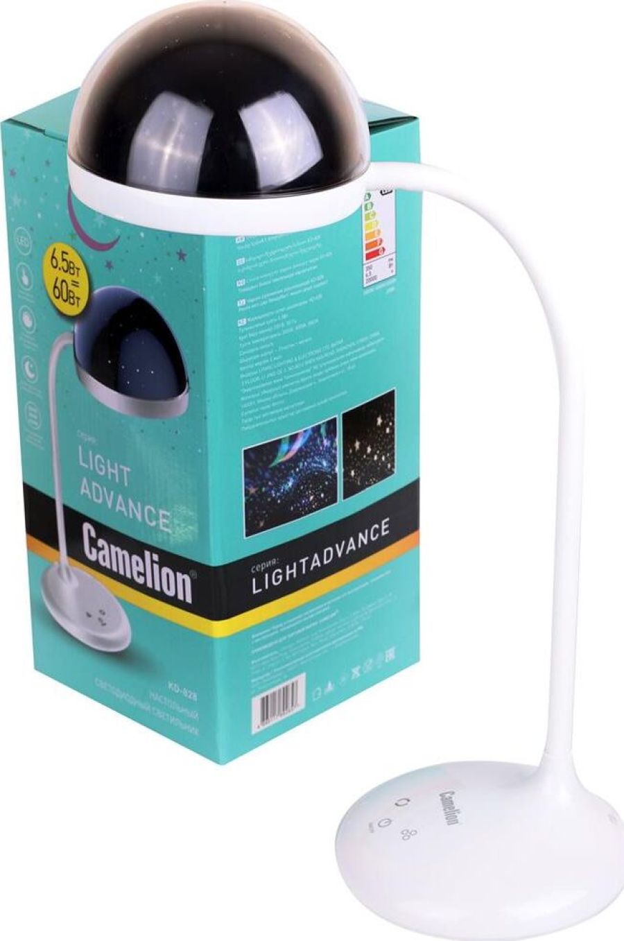 "Настольный светодиодный светильник Camelion KD-828 сочетает в себе функцию местного освещения рабочих мест в офисах, в домашних интерьерах, в комнатах детей и подростков и функцию RGB-проектора звездного неба. Источник света - встроенные светодиоды, мощность 6,5 Вт, макс. световой поток - 360лм, основание и плафон изготовлены из ABS-пластика, гибкая металлическая стойка в силиконовом кожухе позволяет регулировать угол наклона плафона кольцевой формы. Светильник имеет верхнюю часть плафона в виде темной полусферы, которая нужна для создания проекций звезд. При включении режима Звездное небо вы сможете получить маленький планетарий на стенах и потолке комнаты,причем цвет звездного неба сможете выбрать самостоятельно. Подсветка звездного неба светодиодная, поэтому для получения проекции звезд и луны в комнате должно быть темно. Этот проектор звезд понравится всем членам семьи.