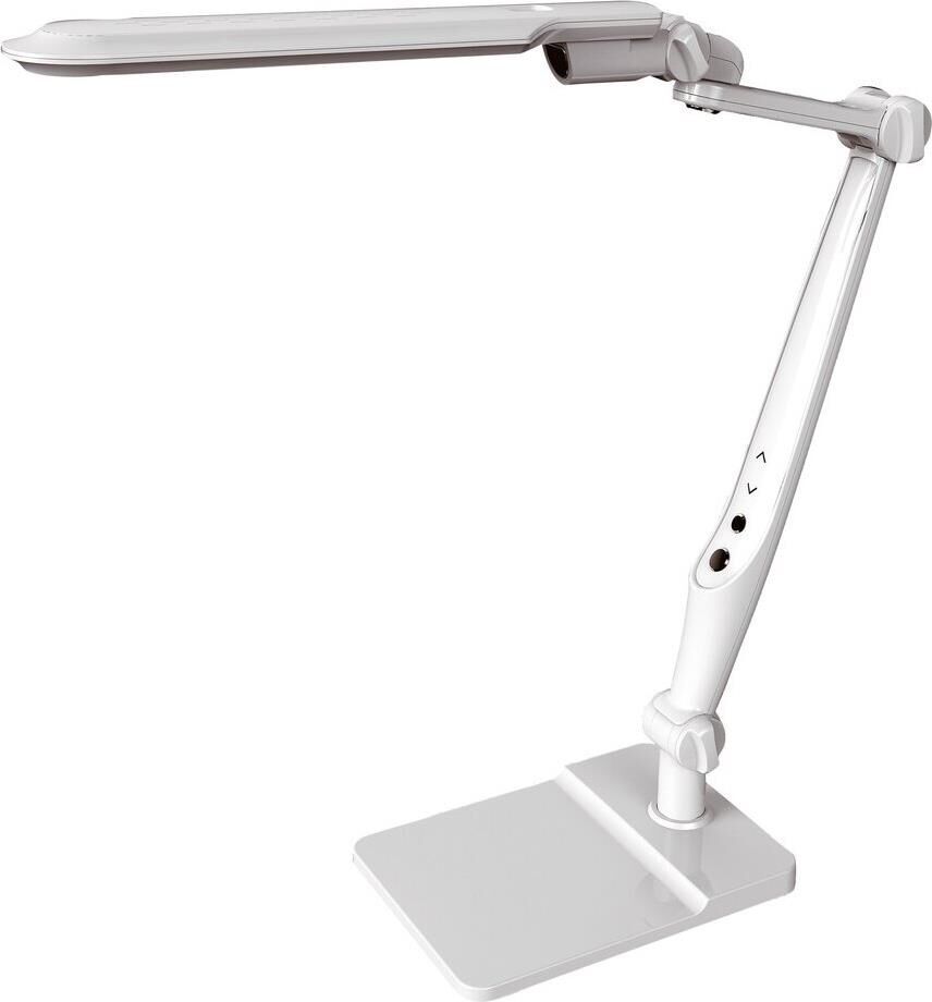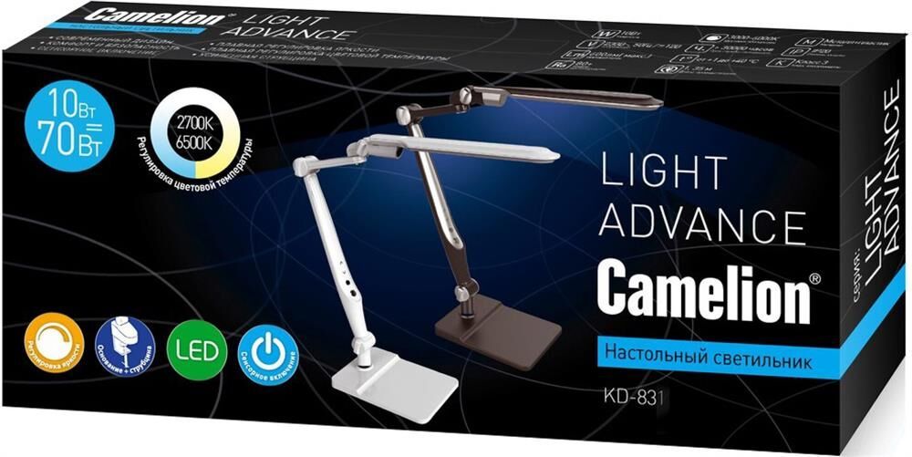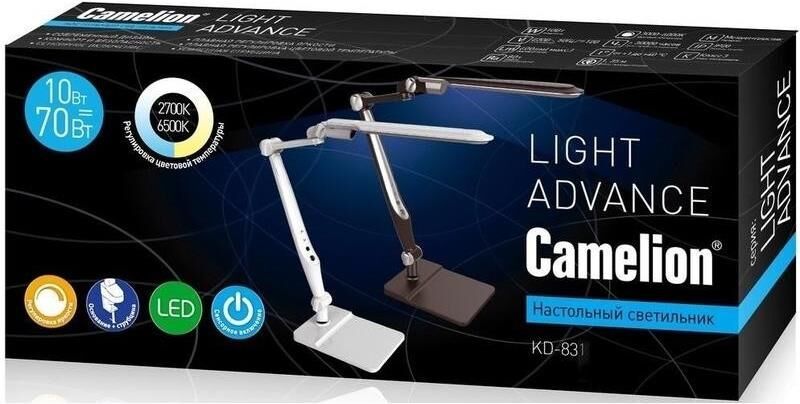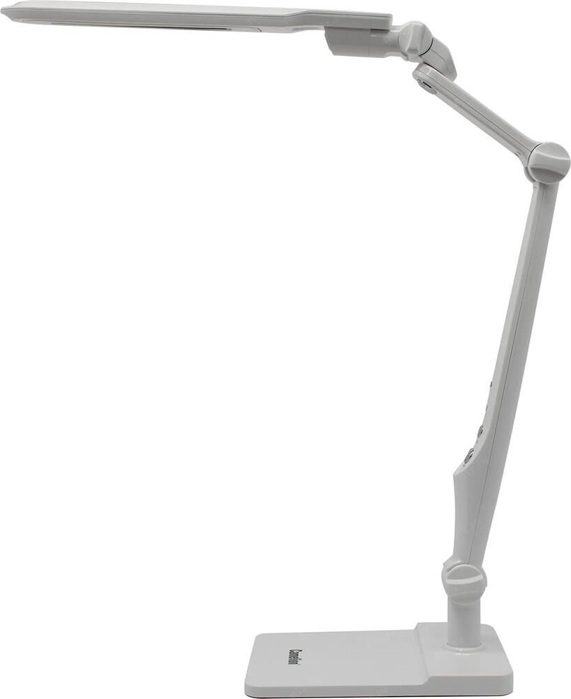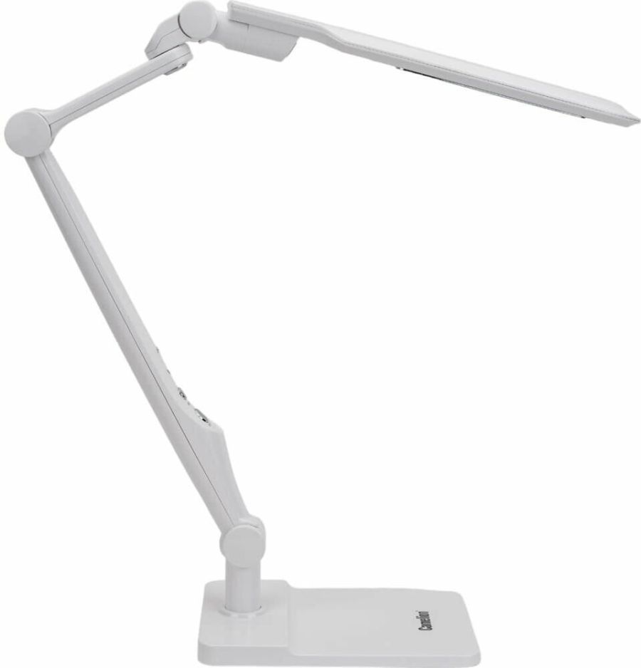 Настольный светодиодный светильник (струбцина+основание) KD-831 C01 белый, размер 458х196х78мм, источник света - встроенные светодиоды, мощность 10Вт, питание 230 В, 50 Гц, световой поток - 600лм, пластик, длина провода 1,35 м. Регулировка цветовой температуры 3000-6000К.