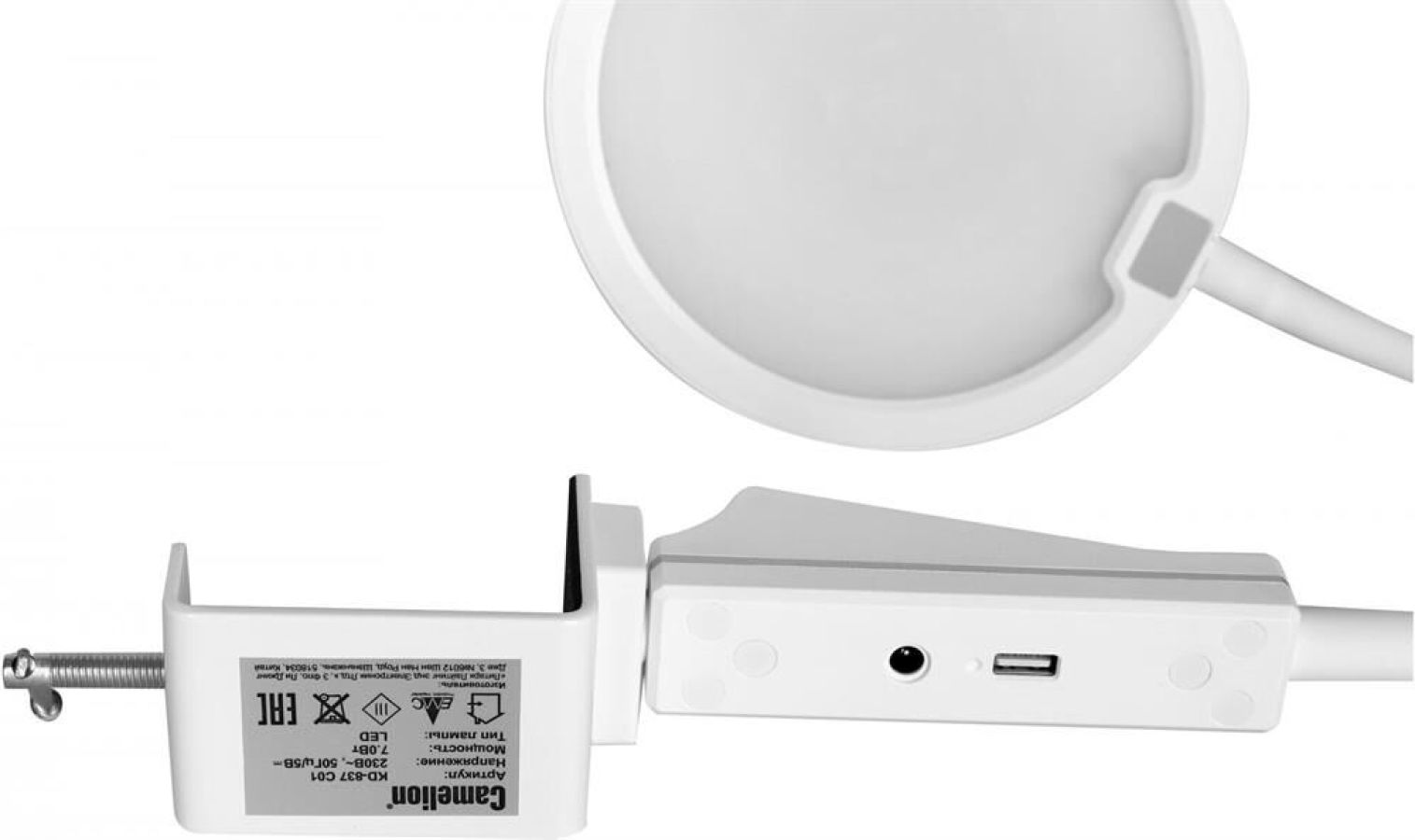 "Светодиодный настольный светильник на струбцине Camelion KD-837 может использоваться в качестве источника местного освещения как в домашних помещениях, так в офисных и учебных учреждениях. Мощность 7Вт, яркость 450 лм, с высоким индексом цветопередачи ( Ra > 85). Светильник имеет пять уровней регулировки яркости и пять режимов цветовой температуры (от 3000К до 6000К). Сенсорная панель управления световыми режимами находится на нижней части стойки. Светильник имеет USB-разъём 5В, 1А. Гибкая металлическая стойка имеет силиконовое покрытие. Мощная металлическая струбцина надежно фиксирует светильник на любой поверхности толщиной до 6,5 см. Пластиковый плафон имеет форму диска диаметром 16 см. Максимальная высота плафона над уровнем стола в рабочем положении ~ 42 см. Длина провода питания – 150 см."