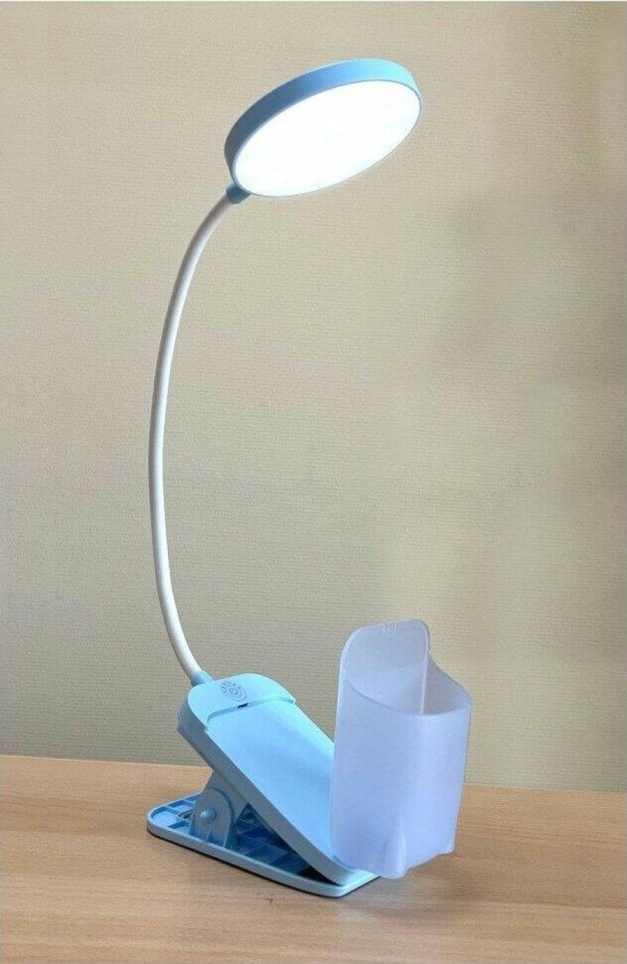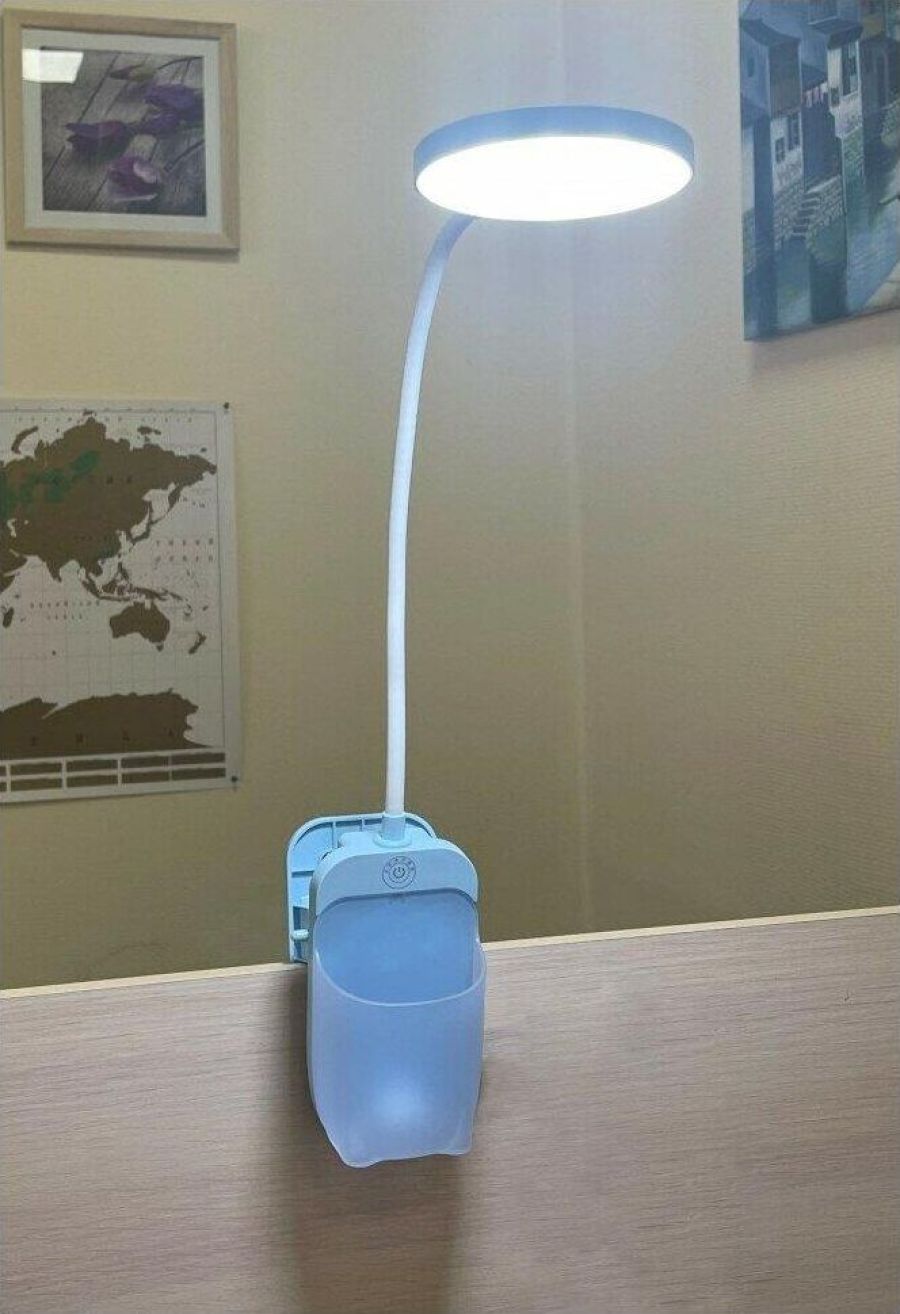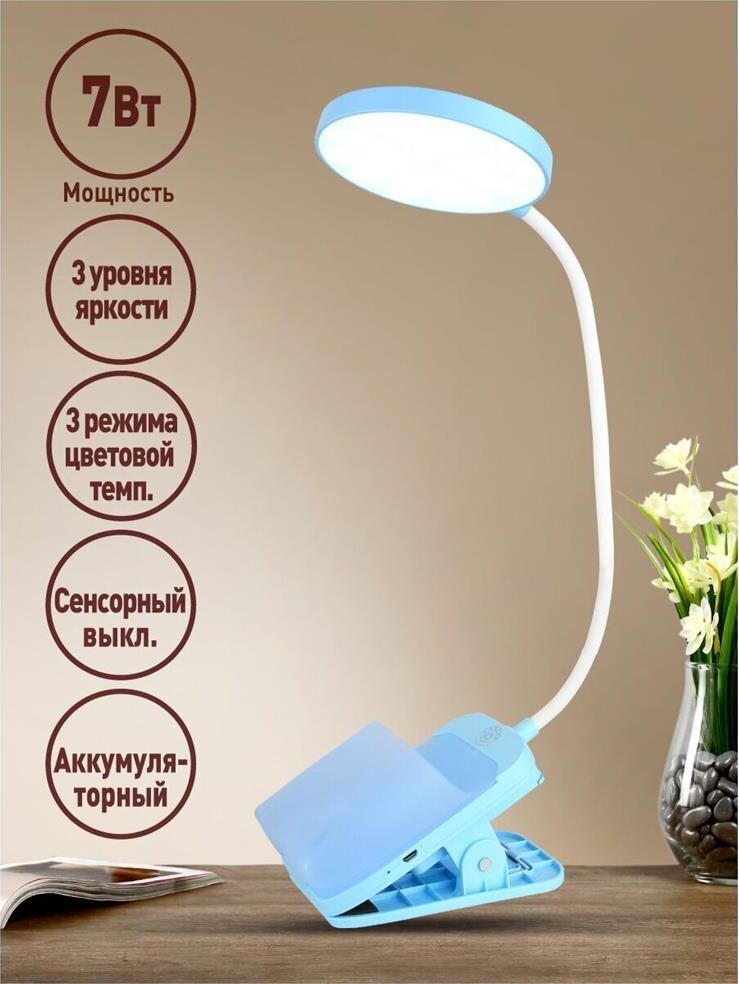 Настольный светодиодный светильник ULTRAFLASH UF-751 C13 цвет голубой. Мощность 7Вт. 3 уровня яркости. Смена цветности свечения от 2800 до 6000К, сенсорное управление. Пенал+прищепка+встроенный аккумулятор.