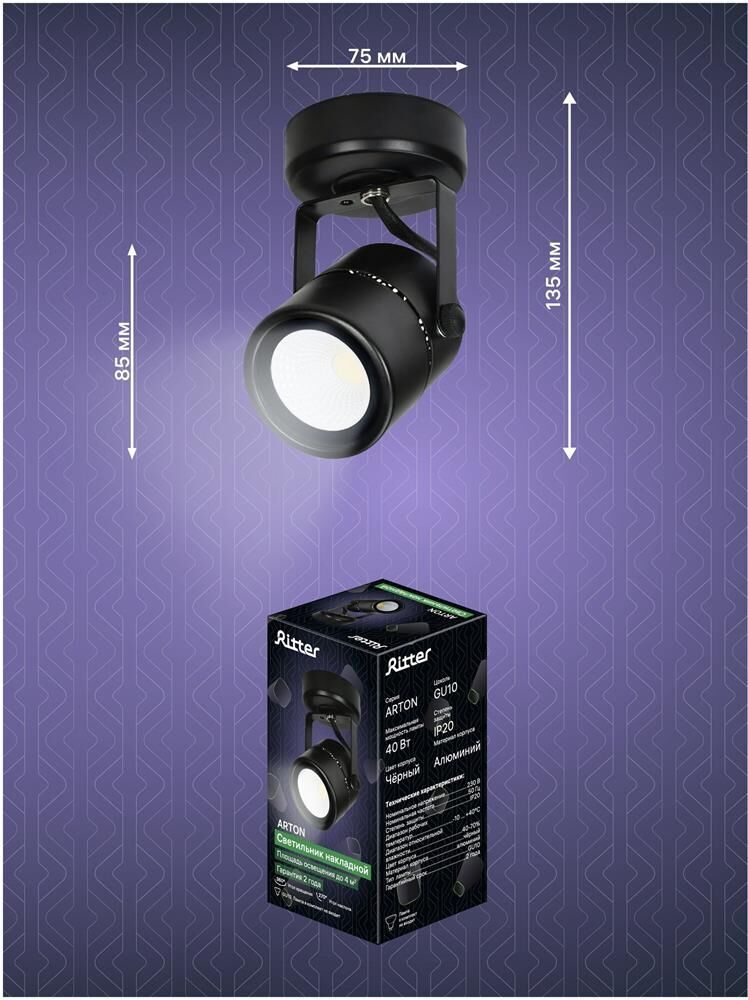 Серия Arton Цвет корпуса черный Материал корпуса алюминий Длина 60 мм Ширина 90 мм Высота 140 мм Номинальная частота 50 Гц Номинальное напряжение 230 В Степень защиты IP20 Тип лампы GU10 Максимальная мощность лампы до 40 Вт