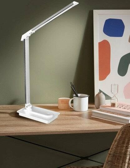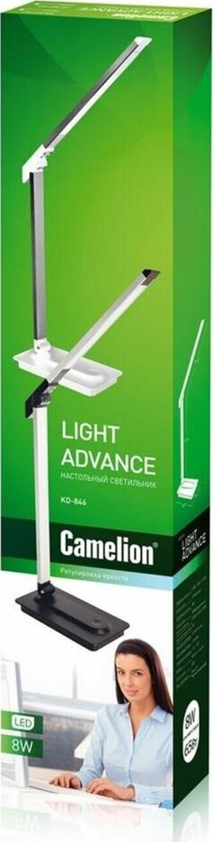 """Стильный дизайн светильника Camelion KD-846 украсит интерьер, оформленный в любом стиле. Плафон и стойка светильника изготовлены из алюминия, а основание -из прочного ABS-пластика. При транспортировке и хранении светильник может быть компактно сложен. Тип установки светильника : на основание. После установки светильника на стол возможно регулировать наклон стойки и наклон плафона. Источник света – светодиоды 2-х температур свечения интегрированные в плафон светильника, позволяющие иметь 3 режима цветовой температуры (3000, 4500, 6000 К). Применение разных цветовых температур свечения позволяет создать комфортную атмосферу для работы, учебы или отдыха. Три ступени регулировки яркости. Мощность- 8 Вт. Максимальный световой поток 400 лм. На основании светильника расположена одна сенсорная кнопка управления светом: вкл/выкл, плавное изменение яркости, изменение цветовой температуры.