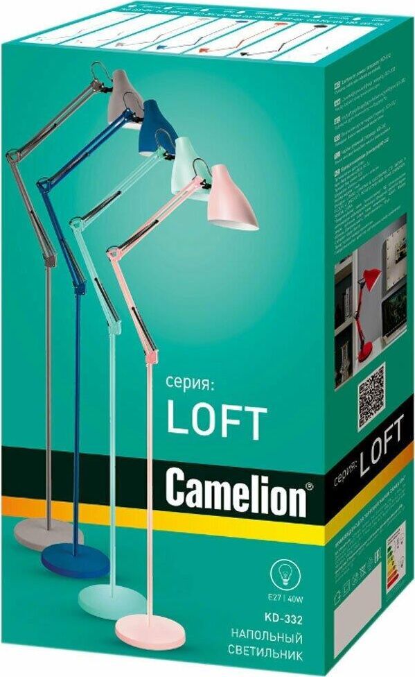 Напольный светильник/торшер Camelion KD-332 C06 синий, размеры 1750х180х200мм, источник света - ЛОН, тип лампы - 40/A/E27, патрон E27, питание ~230В, 50Гц, макс. мощность 40Вт, материал - металл, длина провода - 1,6м, выключатель на проводе, гарантия 12 месяцев