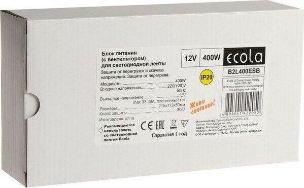 ECOLA LED strip Power Supply 400W 220V-12V IP20 блок питания (с вентилятором) для светодиодной ленты Степень защиты IP20 Мощность 400W Напряжение входное 220V Напряжение выход 12V