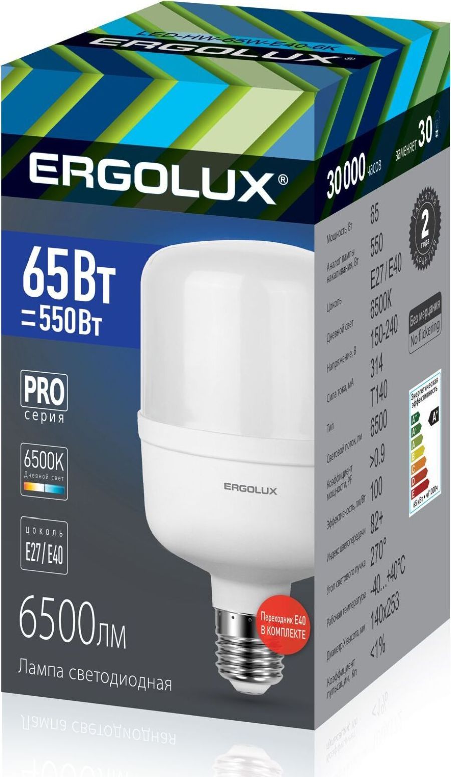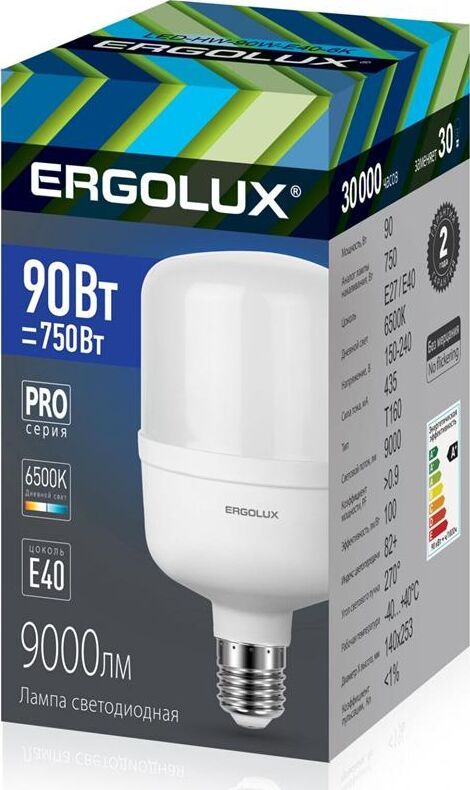 Потребляемая мощность, Вт 90 Цоколь E40 Тип лампы Высокой мощности Аналог лампы накаливания 750 Световой поток, Лм 9000 Цветовая температура, K 6500K — Дневной свет Индекс цветопередачи 82+ Угол светового пучка 270 Напряжение 150-270 Рабочая температура, °C -30…+40°С Размеры лампы (DxL), мм 150*280 Срок службы 30000