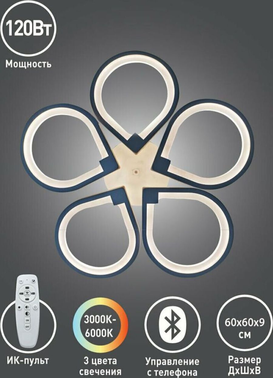 Потолочный светодиодный светильник (люстра) LCL-1008 Размер - 60*60*9см, источник света - встроенные светодиоды, Мощность - 120Вт., макс.световой поток - 8500лм, изменяемая цветовая температура - 3000К - 6000К, управление с помощью пульта, управление с помощью приложения (Bluetooth), материал: акрил+металл.