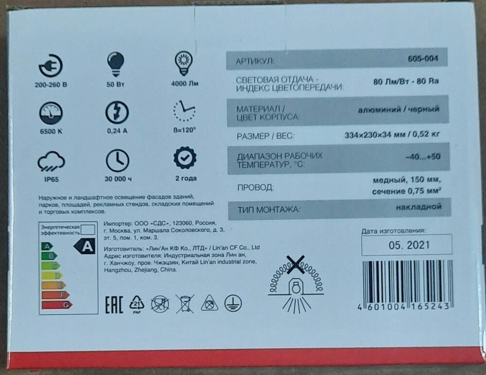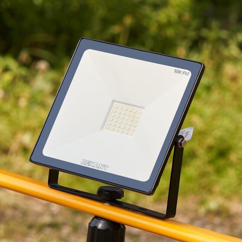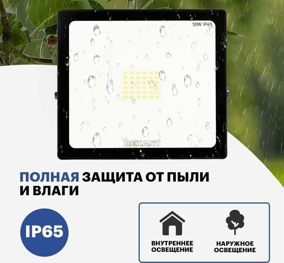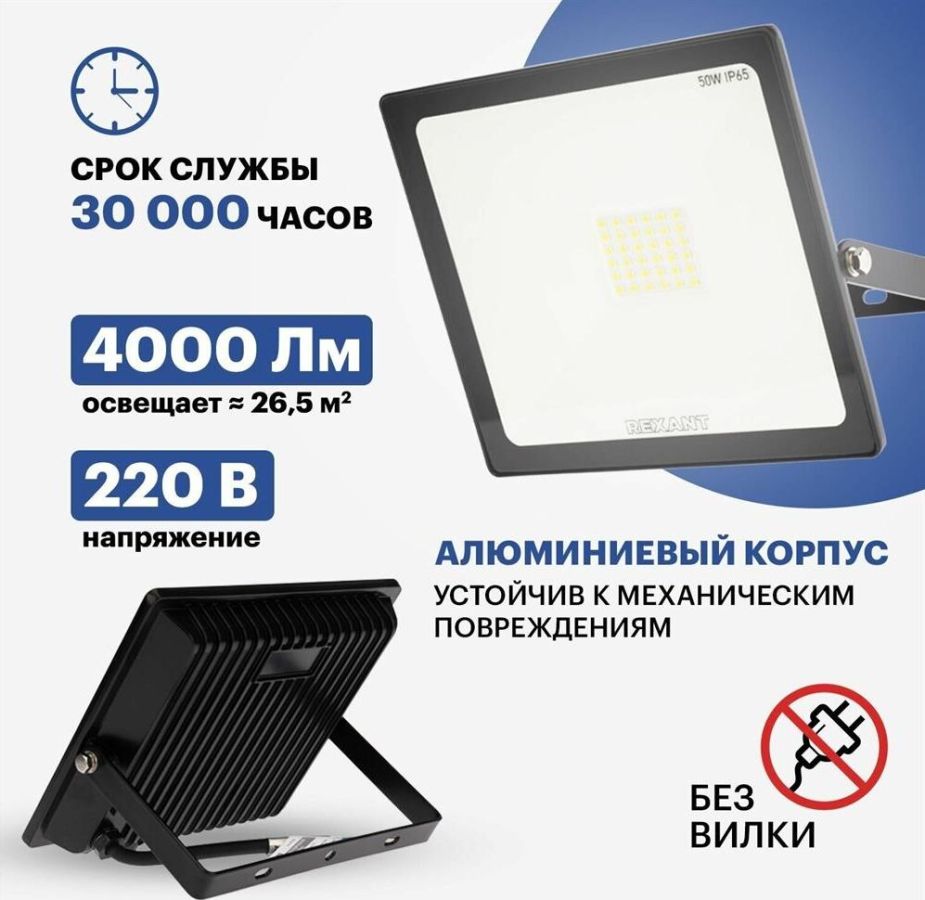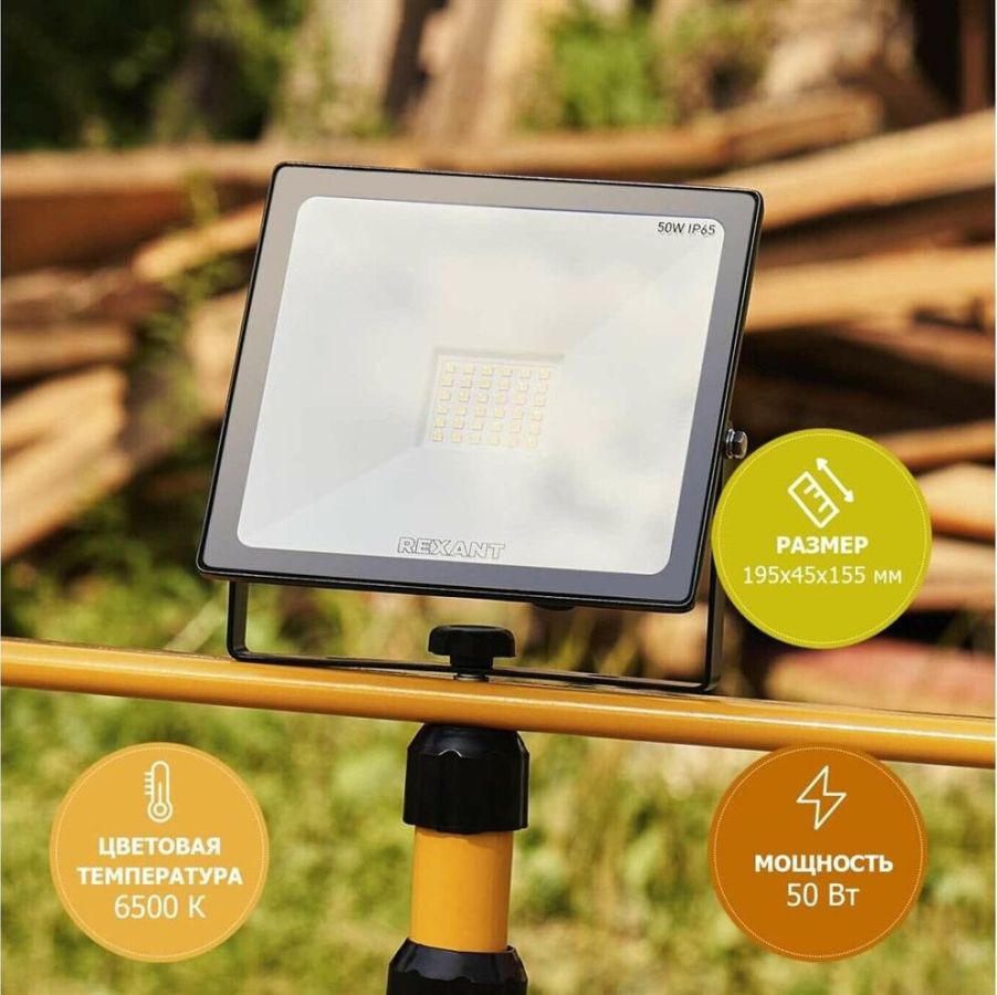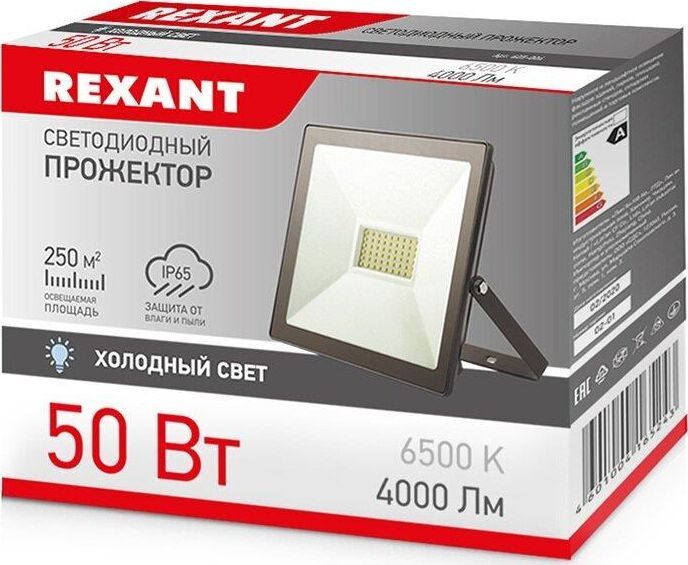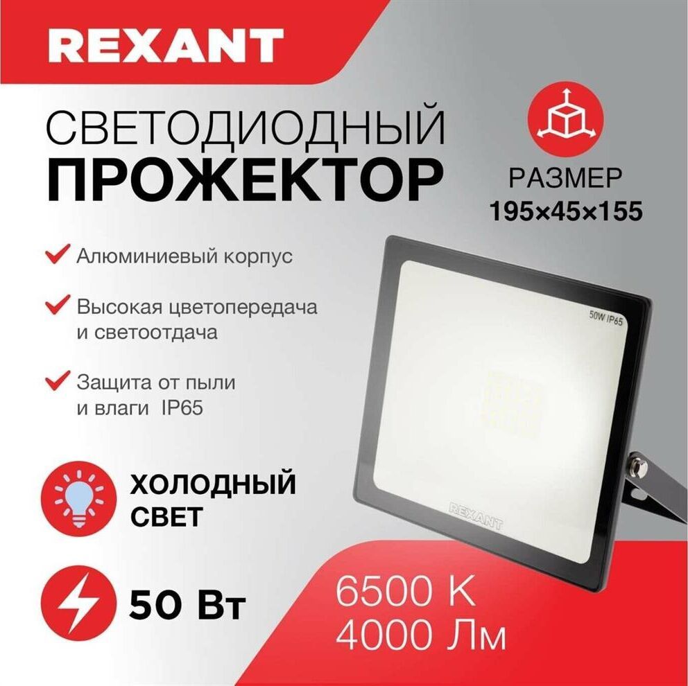 Прожектор светодиодный 50 Вт 200–260В IP65 4000 лм 6500 K холодный свет холодный свет REXANT. Самый ликвидный ассортимент Высокая цветопередача и светоотдача Высокий коэфицент мощности Тип монтажа: накладной Номинальная мощность, Вт: 50 Номинальное напряжение, В: 230 Частота сети, Гц: 50 Диапазон рабочих напряжений, В: 200-260 Рабочий ток, А: 0,24 Цветовая температура, К: 6500 Световой поток, Лм: 4000 Световая отдача, Лм/Вт: 80 Угол рассеивания, град: 120 Индекс цветопередачи, Ra: 80 Класс защиты, IP: 65 Коэффициент мощности, cos?: 0,9 Класс энергоэффективности: A Тип кривой силы света: Д Минимальное расстояние до освещаемого объекта, м: 1 Освещаемая площадь (15 люкс), м2: 250 Высота монтажа (для получения 15 люкс на поверхности), м: 9 Материал шнура: медь Длина шнура, мм: 150 Сечение шнура, м2: 1...0,75 Материал корпуса: алюминий Цвет корпуса: черный Длина, мм: 195 Ширина, мм: 45 Высота или глубина, мм: 155 Вес, кг: 0,52