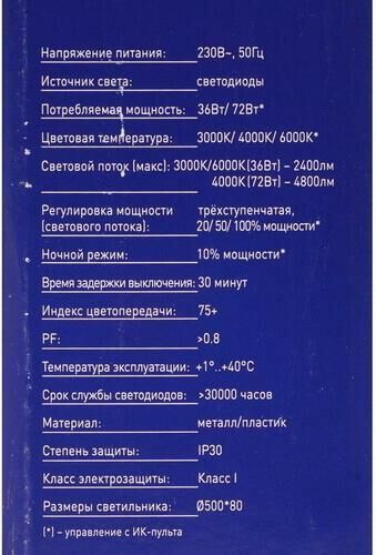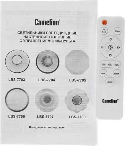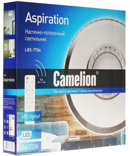 Настенно-потолочный LED светильник управляемый с пультом Camelion LBS-7704, диаметр 500мм, мощность 72Вт, аналог лампы накаливания - 380, световой поток - 4800лм, цветовая температура 3000-6000К, питание 230В / 50Гц