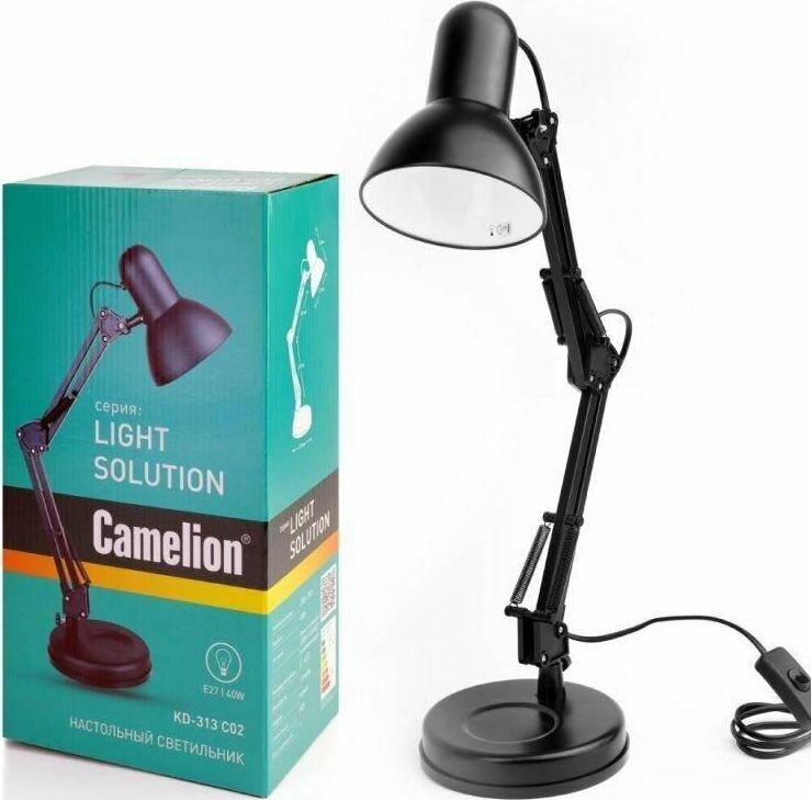 Настольный светильник Camelion KD-313 C02 черный, размеры 285х170х170мм, источник света - ЛОН, тип лампы - 40/А/Е27, патрон E27, питание ~230В, 50Гц, макс. мощность 40Вт, материал - металл, гарантия 12 месяцев
