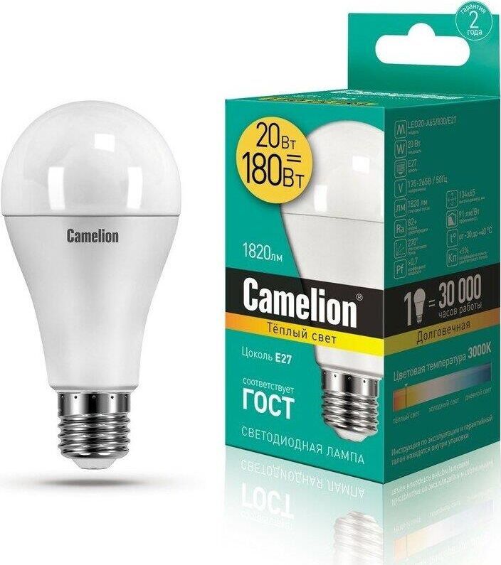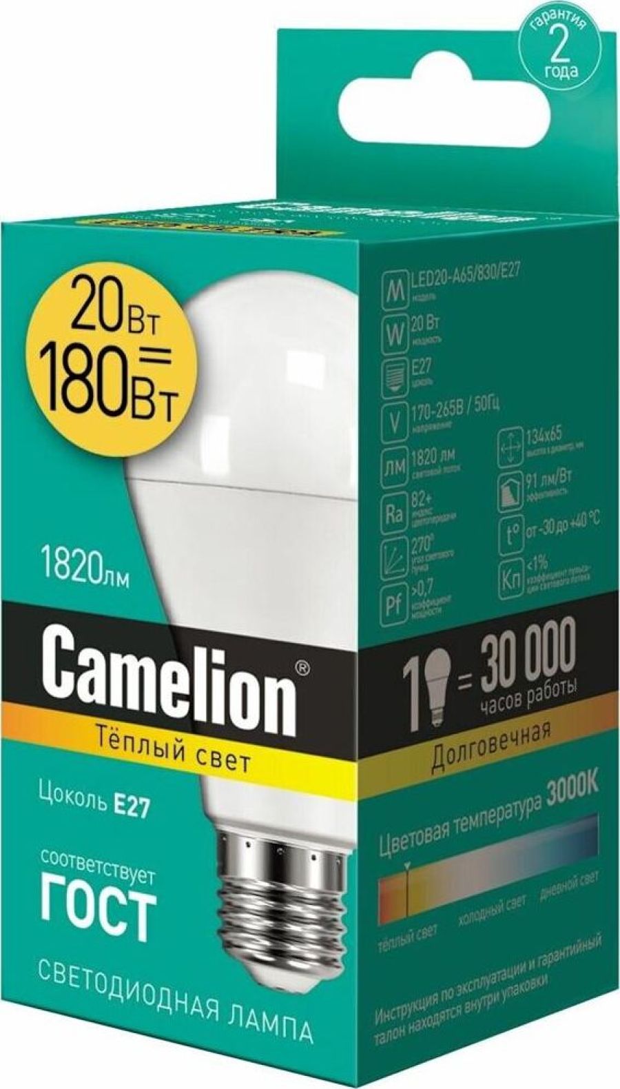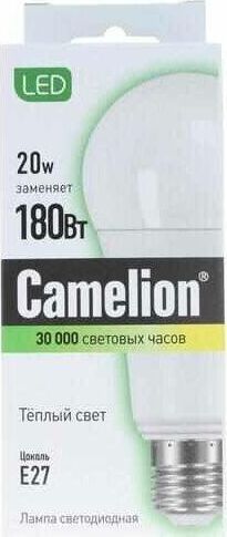 LED лампа, мощность, Вт - 20, напряжение, В - 170-265, световой поток, лм - 1820, форма колбы - груша, цвет колбы - белый, цоколь E27, цветовая температура, К - 3000, угол светового пучка - 270, индекс цветопередачи 80+, срок службы, ч. - 30000