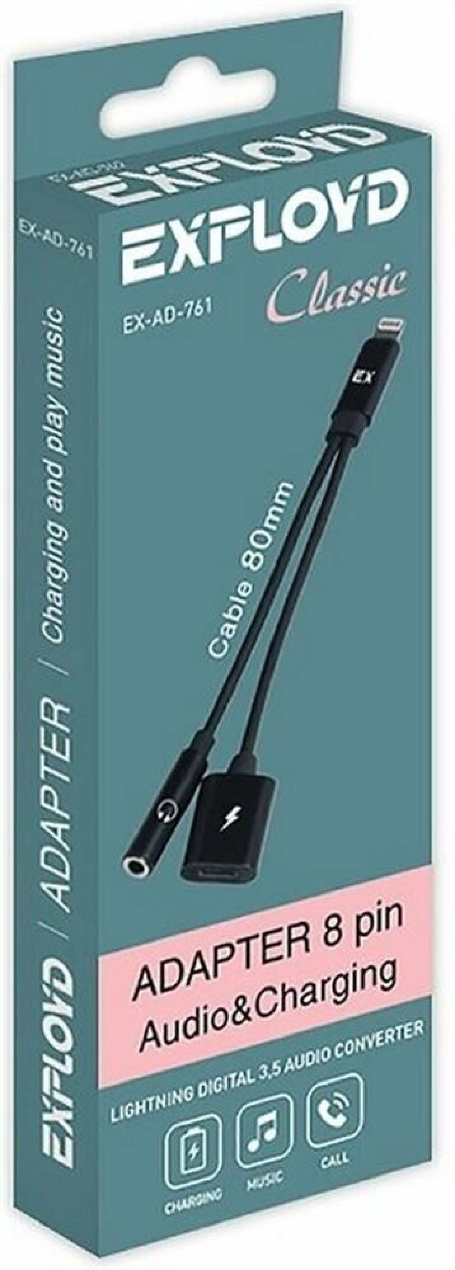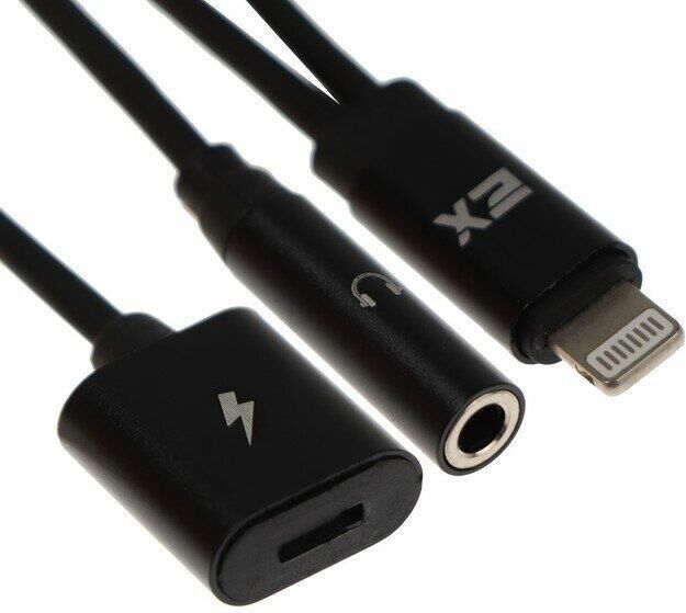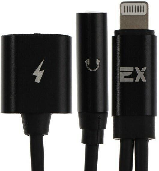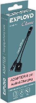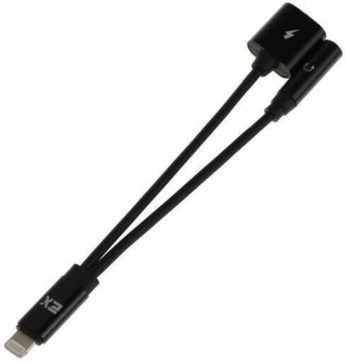 Переходник Jack 3,5mm - 8 Pin. Цвет корпуса - Черный. Особенности - дополнительное гнездо для зарядки.