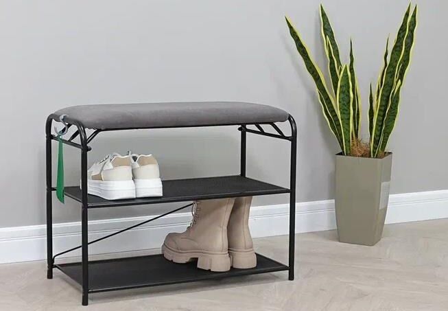 Изделие предназначено для хранения обуви и может использоваться как табурет. Разборно - сварной каркас состоит из стальной трубы. Две полки изготовлены с использованием просечно-вытяжного металлического листа