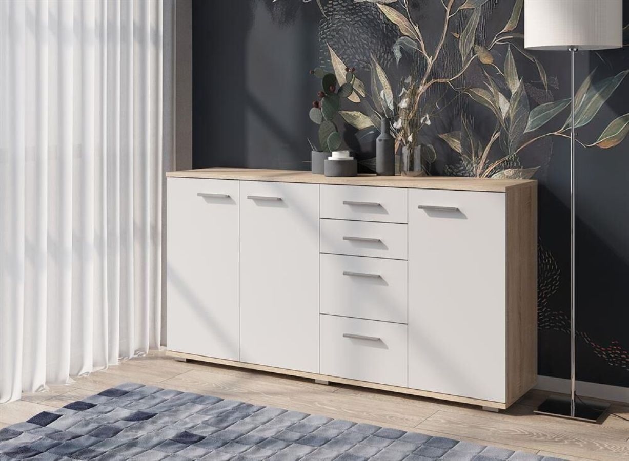 Комод из 6 закрытых отсеков с полками за распашными дверцами, а также четырех выдвижных ящиков с роликовыми направляющими. Корпус и фасад изготовлены из ЛДСП 16 мм. Два цвета на выбор - Белый, Дуб Сонома/Белый. Функционально - компактные габариты изделия... подробнее