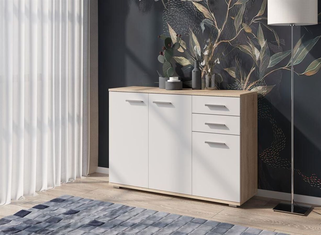 Комод из 5 закрытых отсеков с полками за распашными дверцами, а также двух выдвижных ящиков с роликовыми направляющими . Корпус и фасад изготовлены из ЛДСП 16 мм. Два цвета на выбор - Белый, Дуб Сонома/Белый. Функционально - компактные габариты изделия займет минимум пространства и поможет организовать универсальную систему хранения. Эстетично - универсальное современное цветовое решение. Практично - вместительный комод с удобной конструкцией гармонично впишется в любой интерьер. А так же столешницу комода можно использовать в качестве тумбы для ТВ. Размер изделия (ШхВхГ) 103,4 х 74 х 34 см.