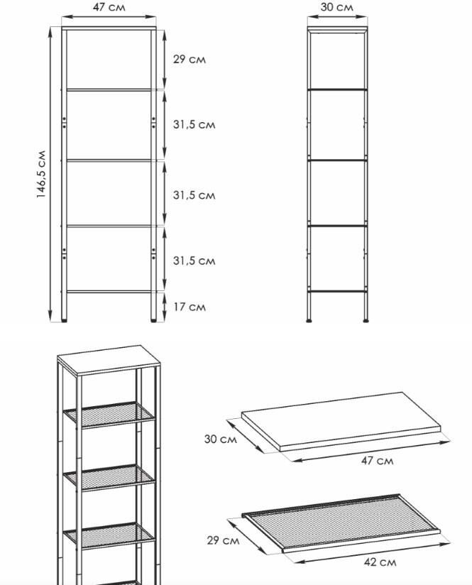 Изделие предназначено для хранения домашних и офисных предметов. Представляет собой стеллаж с 5 полками, выполненными из просечно-вытяжного листа и верхней полки из ЛДСП. Разборный каркас состоит из стальной профильной трубы 15х25 мм. В комплект входят регулируемые пластиковые опоры. Все изделие окрашено однотонной, порошковой краской. Допустимая нагрузка на полки до 8 кг.Габариты (Д*Ш*В) — 47 х 30 х 146,5 см