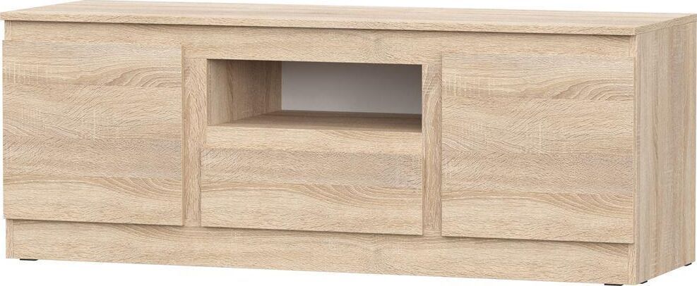 Центральную часть, ТВ тумбы серии Stern занимает выдвижной ящик, над ним имеется открытая ниша. По обе стороны от ящика расположены отделения с глухими дверцами. Основание и столешница изготовлены из ЛДСП 16 мм.. Три цвета на выбор - Белый, Дуб Сонома, Дуб Вотан. Функционально - широкий модульный ряд позволяет создавать любой интерьер. Эстетично - все фасады имеют скошенный край. Практично - на столешнице хватит места для панели с самой большой диагональю, а внутри удобно спрятать все провода, хранить пульты дистанционного управления, игровые приставки, видеоаксессуары.. Размер изделия (ШхВхГ) 135 х 51,3 х 45,3 см.