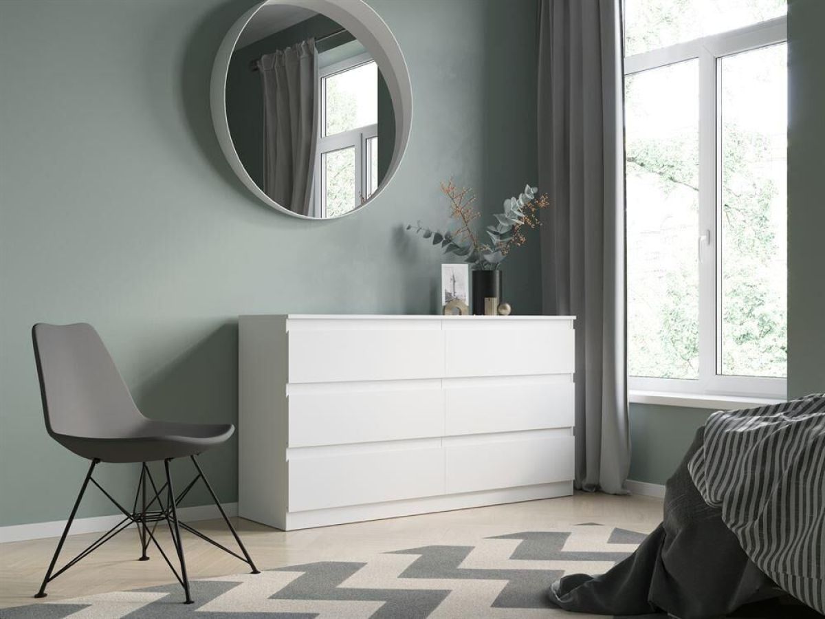 Комод с шестью ящиками. Корпус и фасад изготовлены из ЛДСП 16 мм. Три цвета на выбор - Белый, Дуб Сонома, Дуб Вотан. Функционально - широкий модульный ряд позволяет создавать любой интерьер. Эстетично - все фасады имеют скошенный край. Практично - вместительные выдвижные ящики на роликовых направляющих. Размер изделия (ШхВхГ)156,2 х 85,7 х 43,3 см.