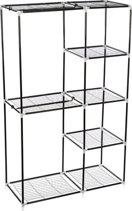 размер — 100*45*170см материал — металл+пластмасса 16*0.26 мм железо с покрытием+металлическая решетка — пластмасса упаковка — цветная коробка Стойка предназначена для удобного хранения одежды и организации пространства. 8 полок позволяют компактно разместить максимум вещей в условиях ограниченного пространства.