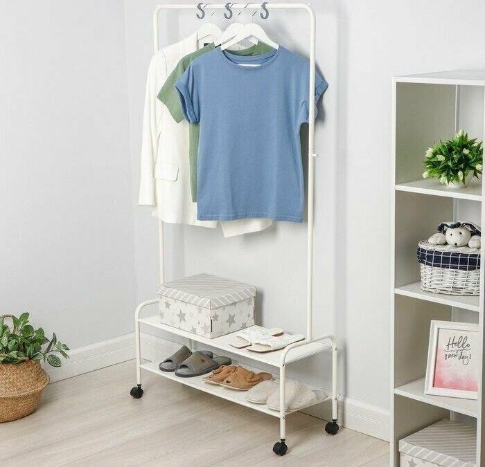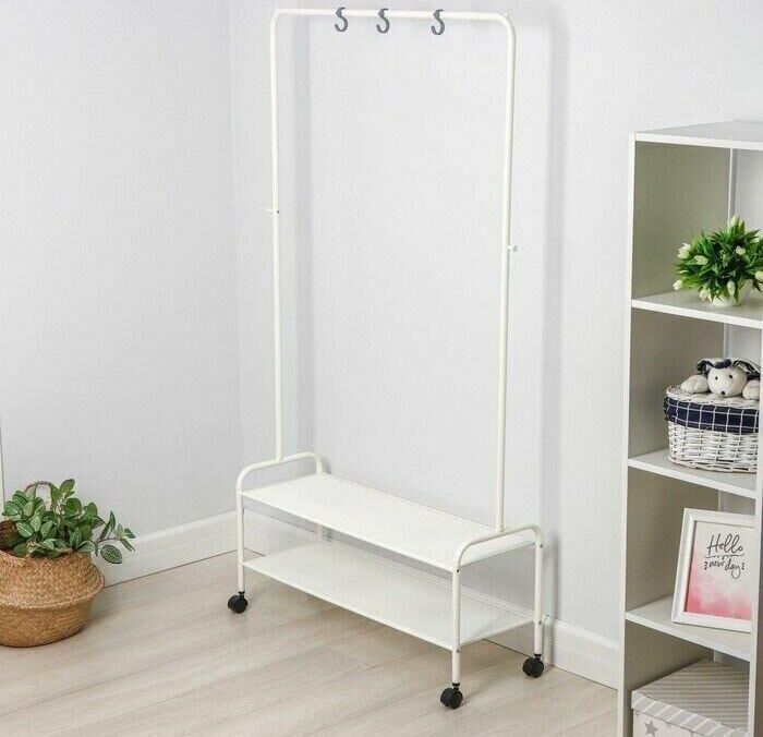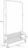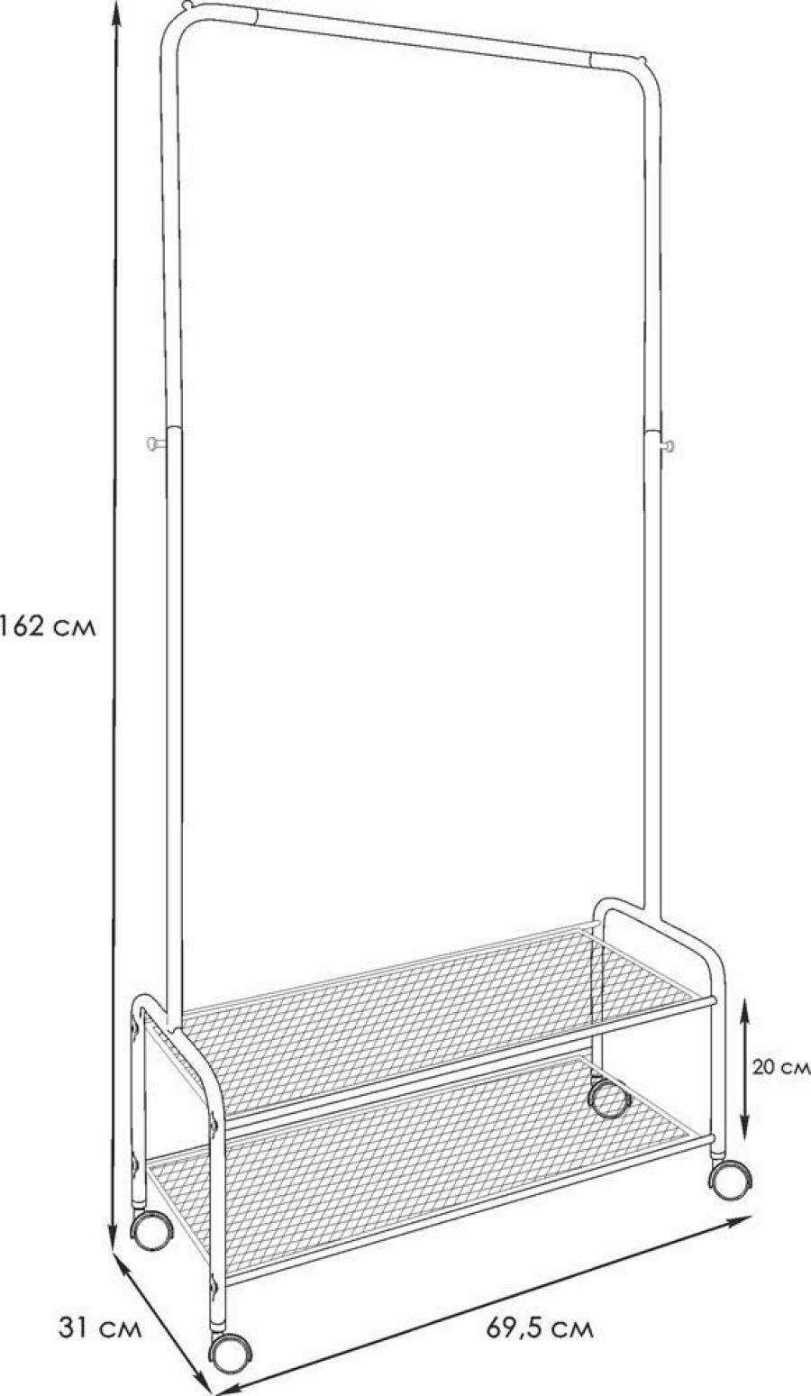 Назначение Для размещения одежды. Материал Труба диаметром 18 мм, стальные шарики; пластиковые подпятники, полимерно-порошковое покрытие, пластик. Габариты (Д*Ш*В) 69,5х31х162 см. Максимальная нагрузка, кг до 20 кг.