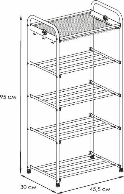 Назначение Для размещения обуви во внутренних помещениях. Материал Сталь, полимерное покрытие, пластик. Габариты (Д*Ш*В) 45,5х30х95см. Максимальная нагрузка, кг До 8 кг на полку.