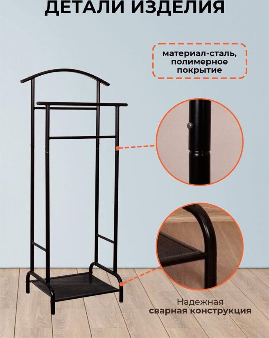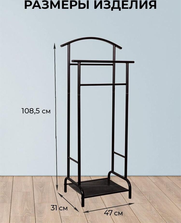 Назначение Для размещения одежды. Материал Сталь, полимерное покрытие, пластик. Габариты (Д*Ш*В) 47х30х108,5 см. Максимальная нагрузка, кг до 3 кг на плечико.