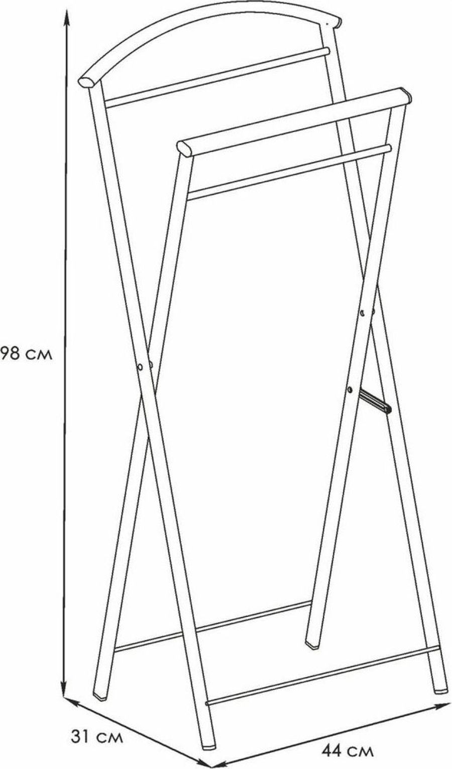 Отличительные особенности: - надежная сварная конструкция. - вместительная модель, на которую с легкостью можно уместить полный комплект костюма – пиджак, рубашку, брюки и галстук. - изящная форма изделия прекрасно впишется в любой интерьер. - В сложенном состоянии практически не занимает место. - общая нагрузка до 10 кг. Габариты (Д*Ш*В) 44х31х98 см. Материал Сталь, полимерное покрытие, пластик.