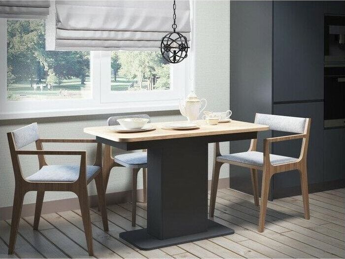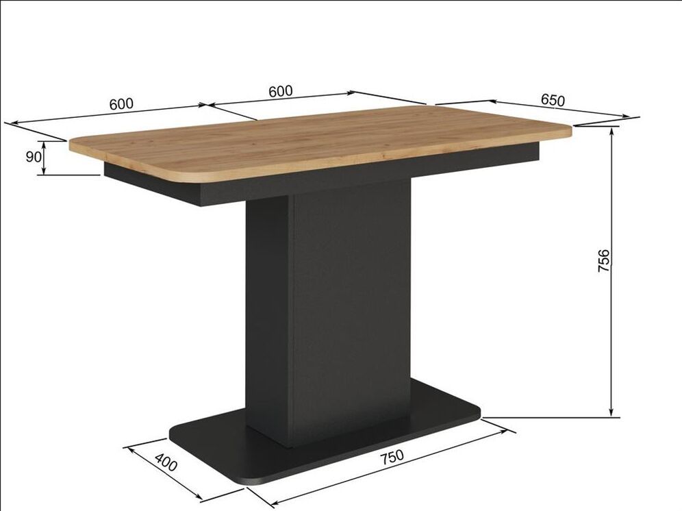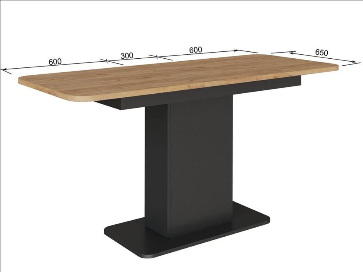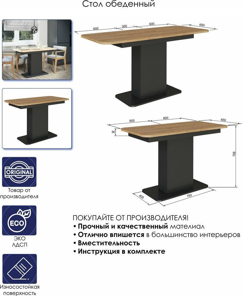 Обеденный стол раскладной, на одной опоре, столешница – ЛДСП 22мм. В сложенном виде столешница имеет размер 650х1200, в разложенном – 650х1500. Ширина 1 200 Глубина 650 Материал фасадов ЛДСП Материал каркасов ЛДСП Срок службы (мес.) 120 Гарантия (мес.) 24