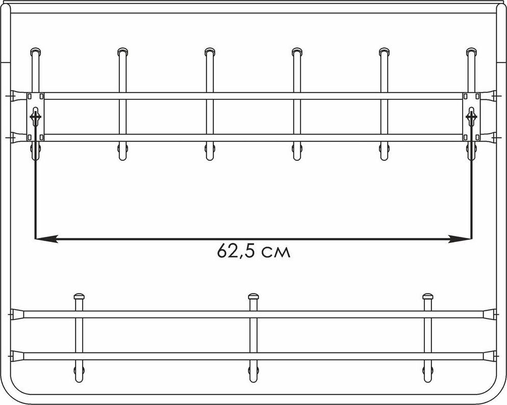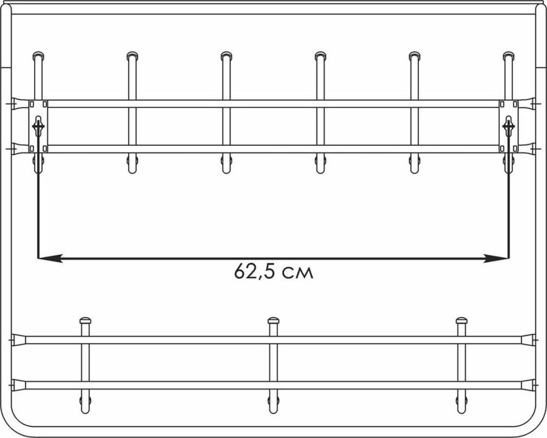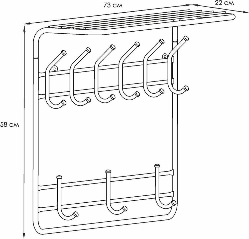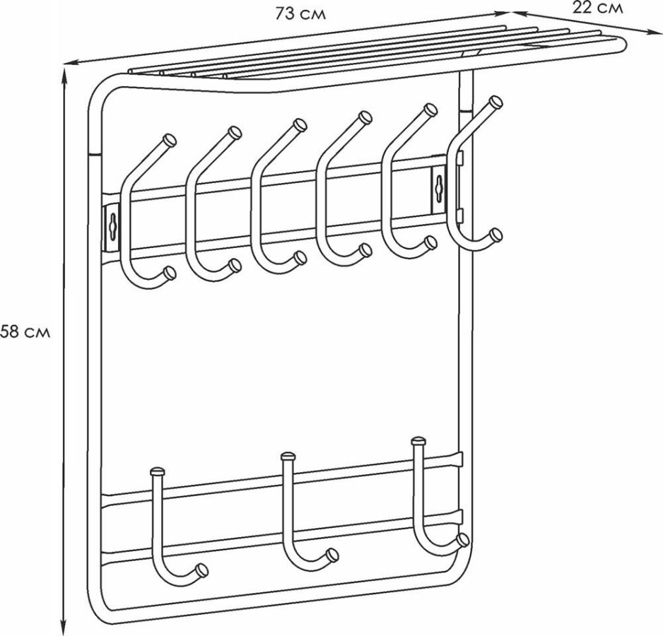 Материал — Сталь, полимерное покрытие. Индивидуальная упаковка — 755х530х100 мм. Габариты (Д*Ш*В) — 73х58х22 см. Максимальная нагрузка, кг — до 5 кг на крючок.