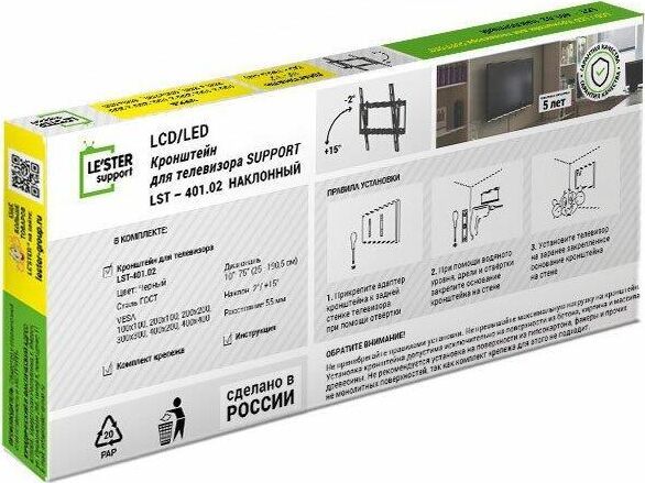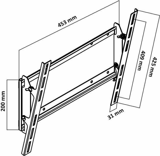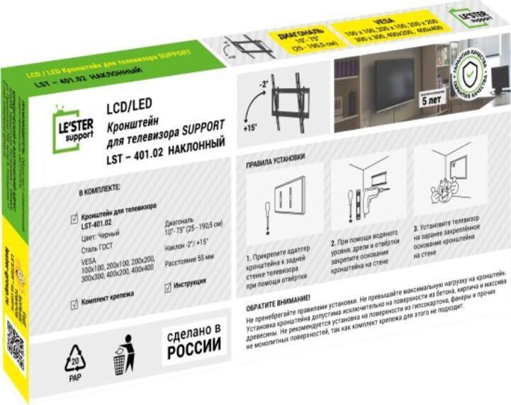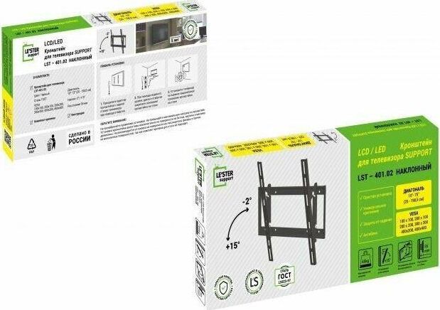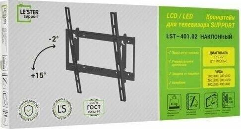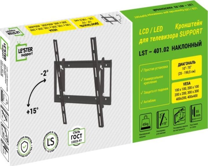 Наклонный Диагональ: 10"-75" (25-190,5см) Расстояние от стены: 55 мм Угол наклона: -3°/+15° Нагрузка: 45 кг Толщина металла 1,5 мм. Регулировка угла наклона без использования инструмента. Vesa 400*400.
